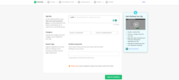 On this page, you are going to provide an overview of your work. Make sure your gig title is short but provides as much detail as possible. You can write something like, “I will translate your documents from English to German.”