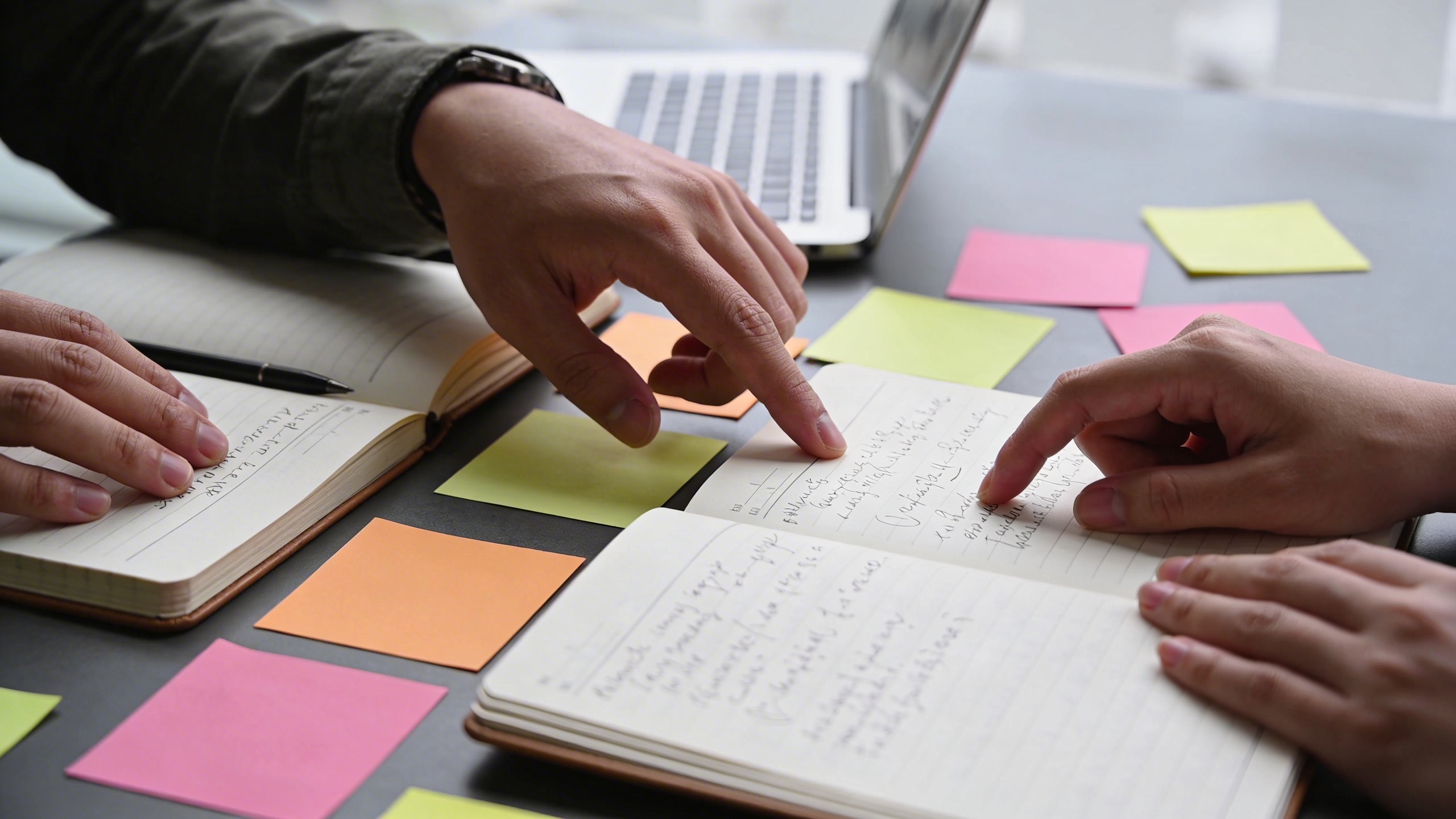 Prompt: "realistic editorial stock photo, two coworkers collaborating at a table, only hands and notebooks visible, sticky notes, laptop edge, bright overcast office light, 35mm lens, candid, no text"