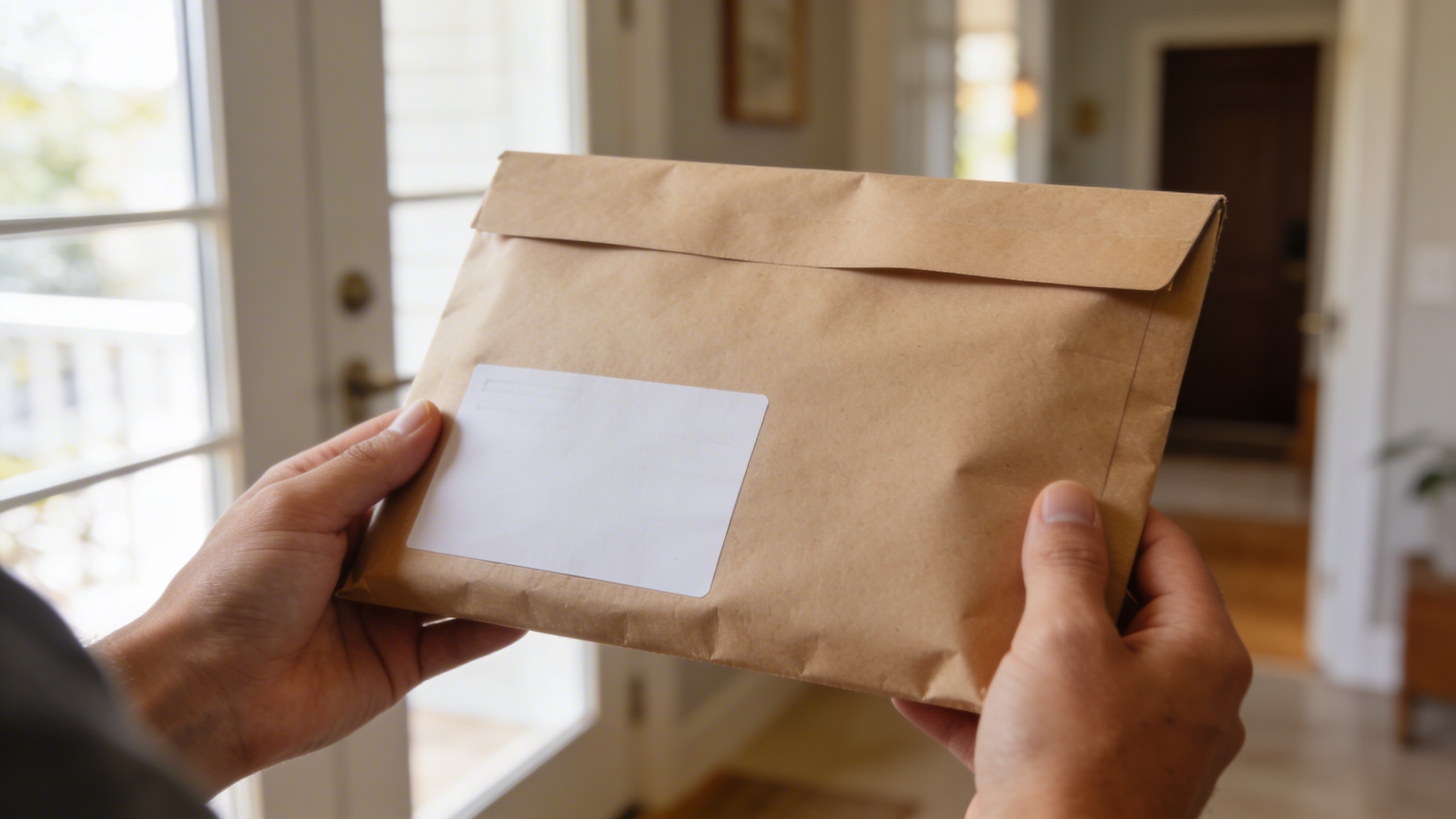 Prompt: "realistic stock photo, close-up of hands holding a plain kraft package mailer with blank label area, modern entryway background, natural window light, 50mm lens, shallow depth of field, realistic paper texture, no text"