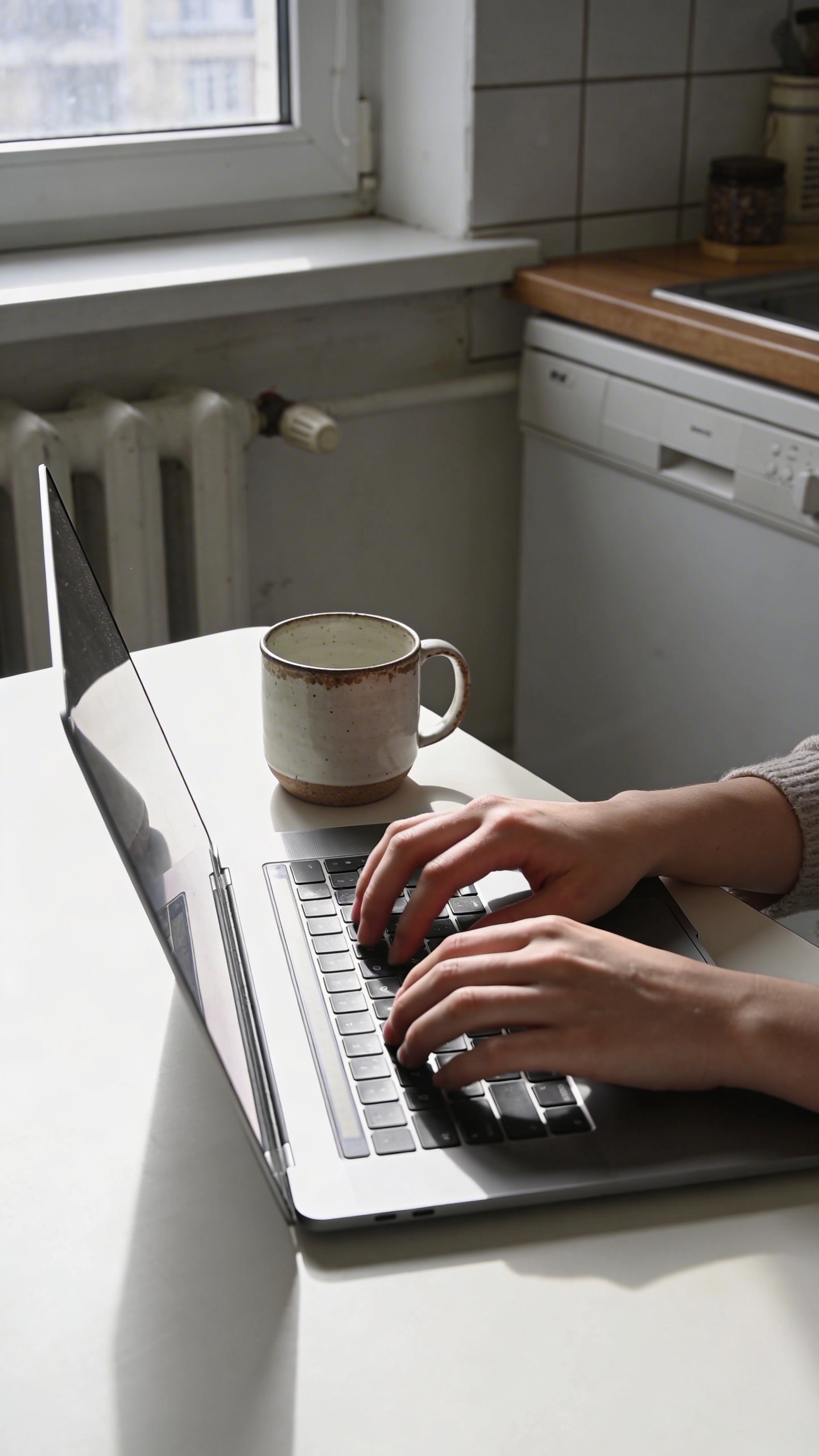 Prompt: "realistic stock photo, candid remote work scene at a small apartment kitchen table, person’s hands typing on laptop next to a chipped ceramic mug, morning window light, soft shadows, 35mm lens, shallow depth of field, subtle film grain, plenty of negative space on left, no text"
