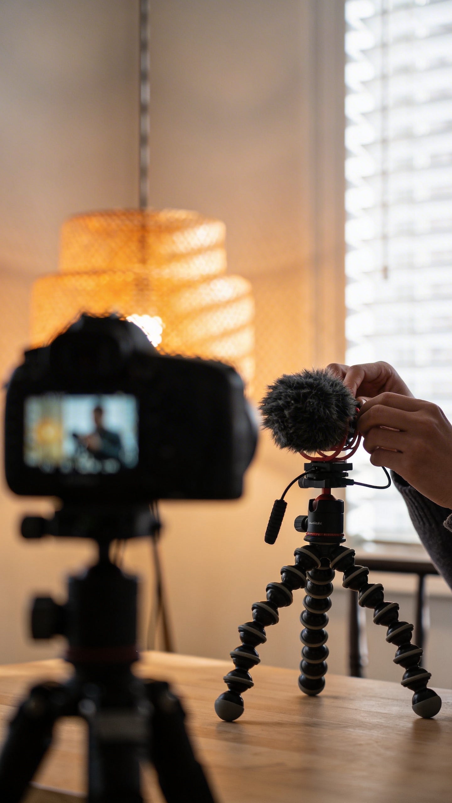Prompt: "realistic editorial stock photo, content creator filming at home, camera on tripod slightly out of focus in foreground, person’s hands adjusting microphone, warm lamp mixed with daylight, 50mm lens, no text"