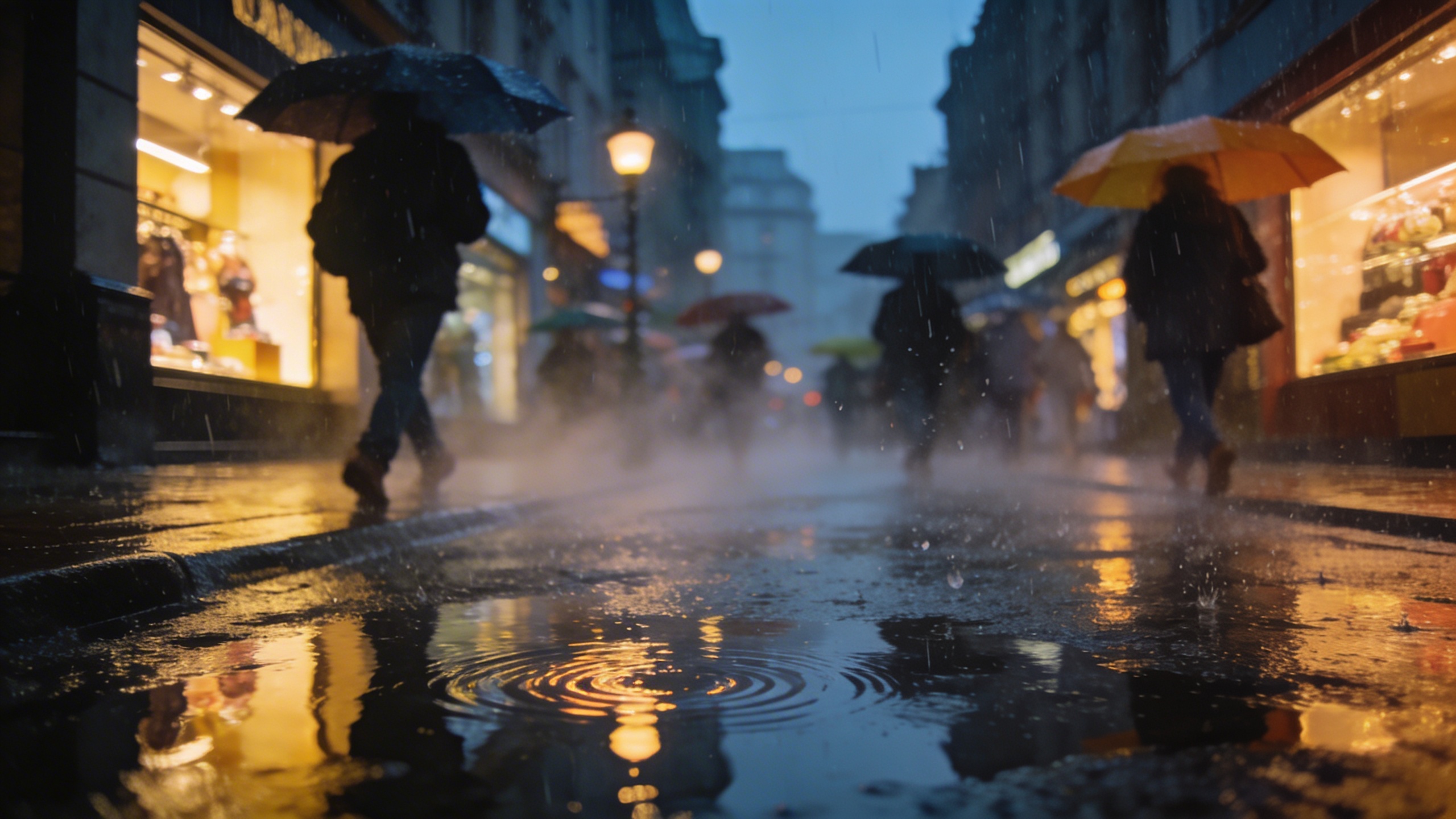 Prompt: "realistic travel stock photo, rainy city street at dusk with reflections on pavement, pedestrians with umbrellas slightly motion-blurred, warm shop lights, 35mm lens, cinematic but natural, no recognizable logos, no text"