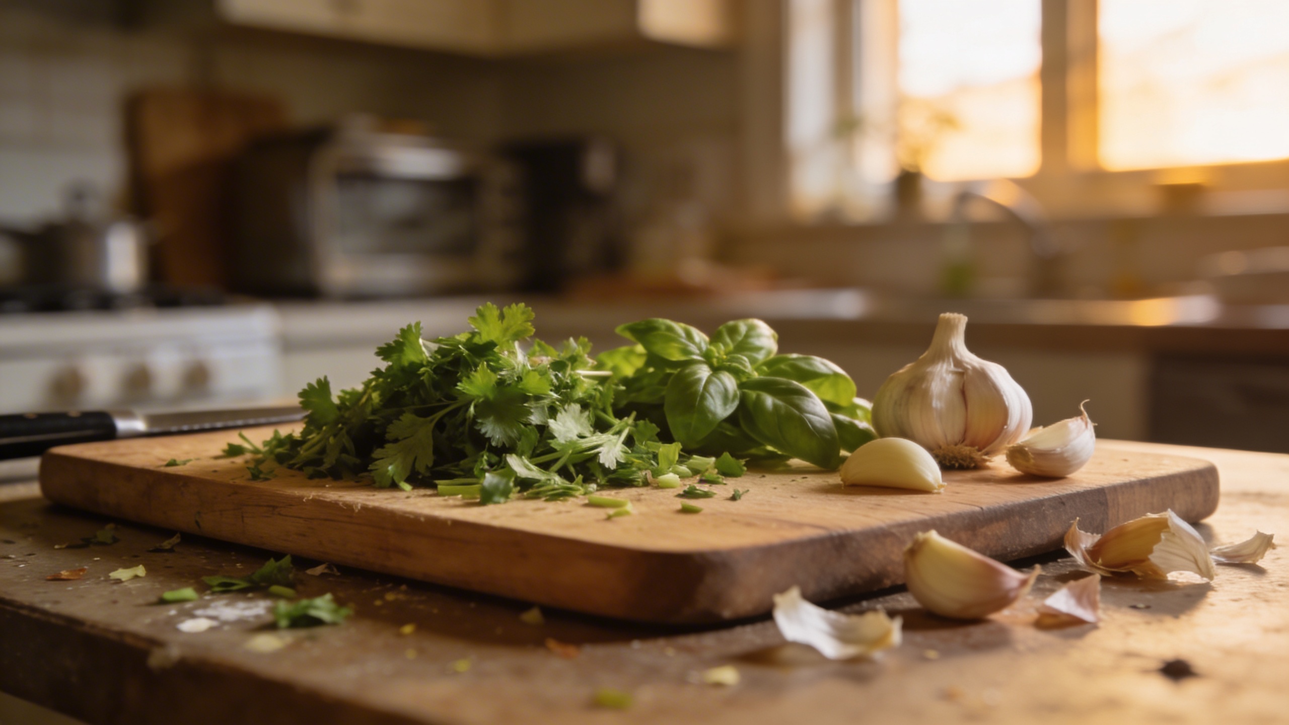 Prompt: "realistic stock photo, home kitchen scene with a cutting board, chopped herbs, garlic cloves, slightly messy counter, soft window light, 35mm lens, natural colors, no text"