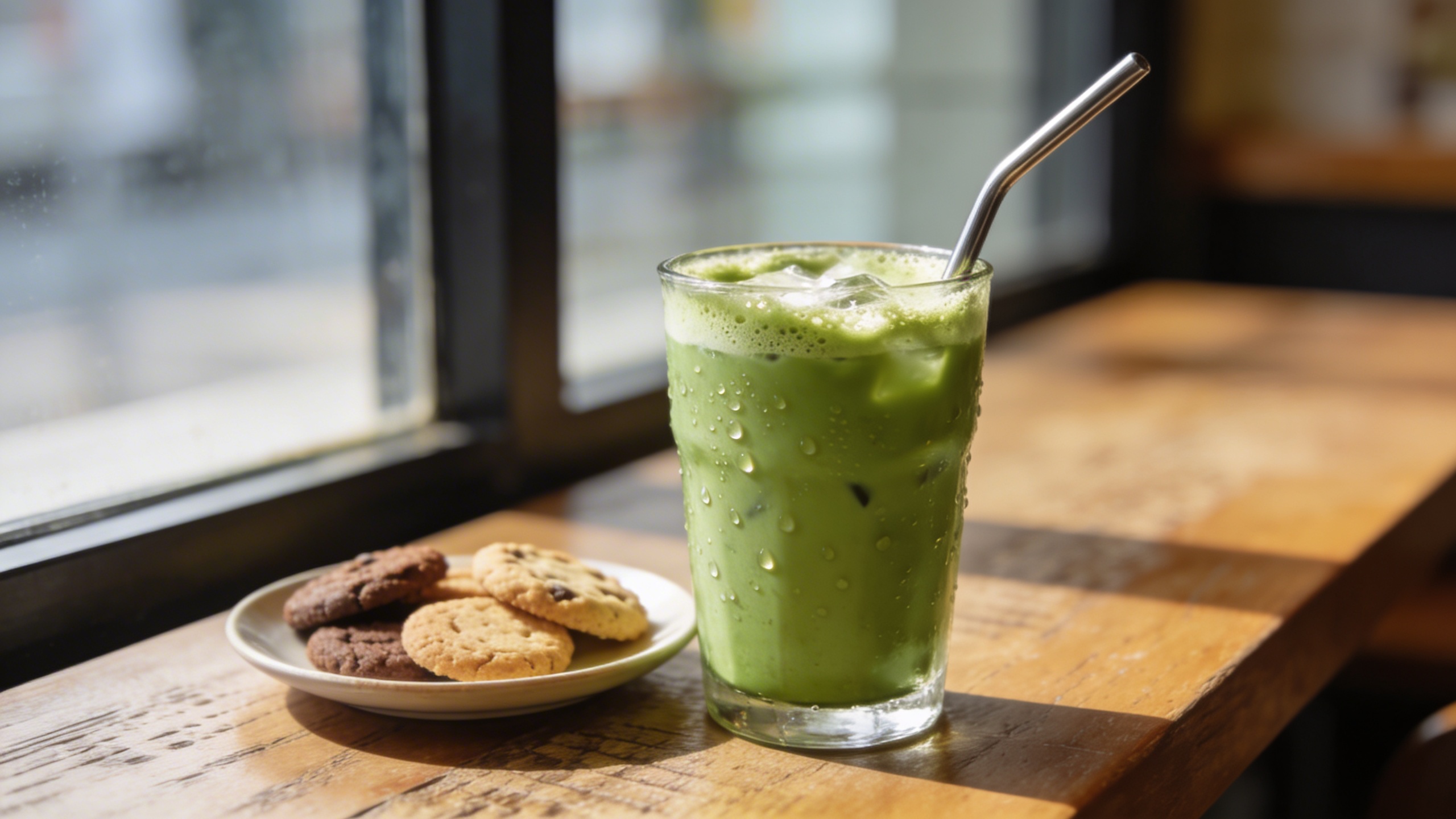 Prompt: "realistic editorial food stock photo, iced matcha in a glass with condensation, metal straw, small plate of cookies slightly out of focus, café table near window, 50mm lens, soft shadows, no text"