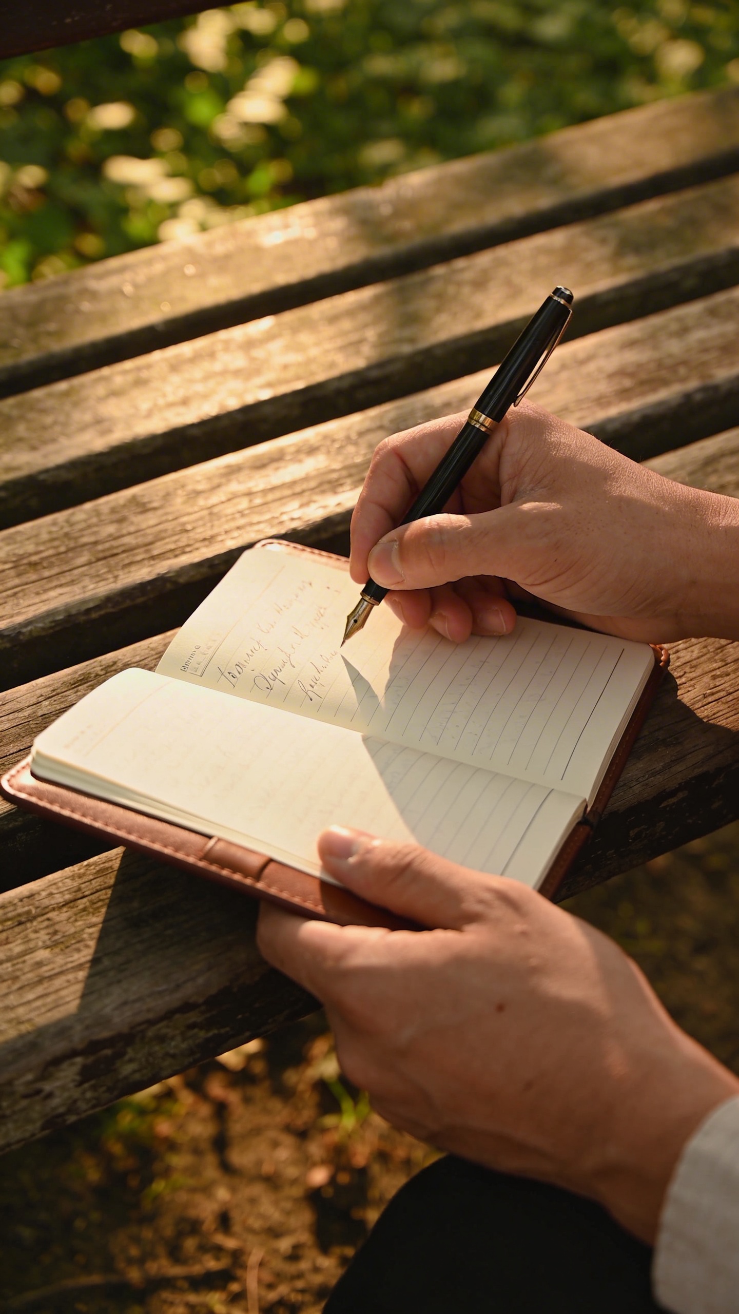 Prompt: "realistic editorial stock photo, person journal writing on a bench in a park, only hands and notebook visible, soft golden hour light, 85mm lens, calm mood, no text"