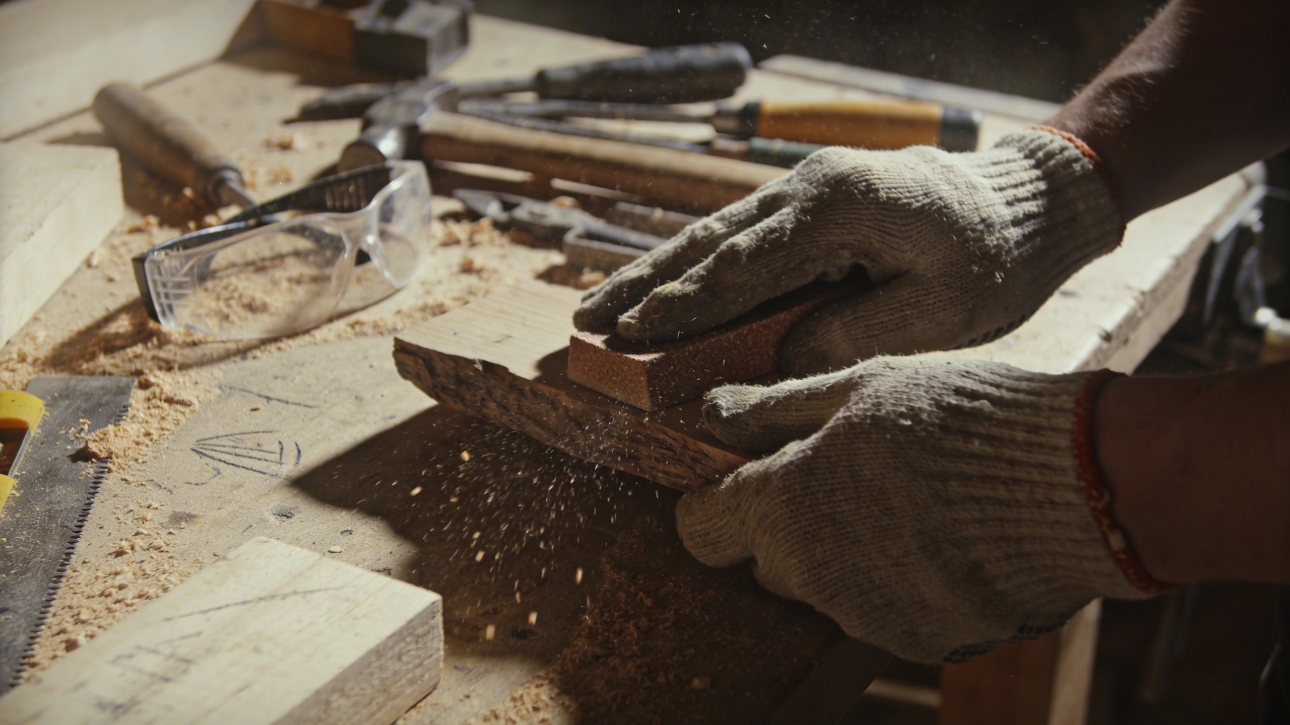 Prompt: "realistic stock photo, small workshop table with tools, sawdust, protective glasses, hands sanding a wooden piece, harsh overhead light, 35mm lens, gritty texture, no text"