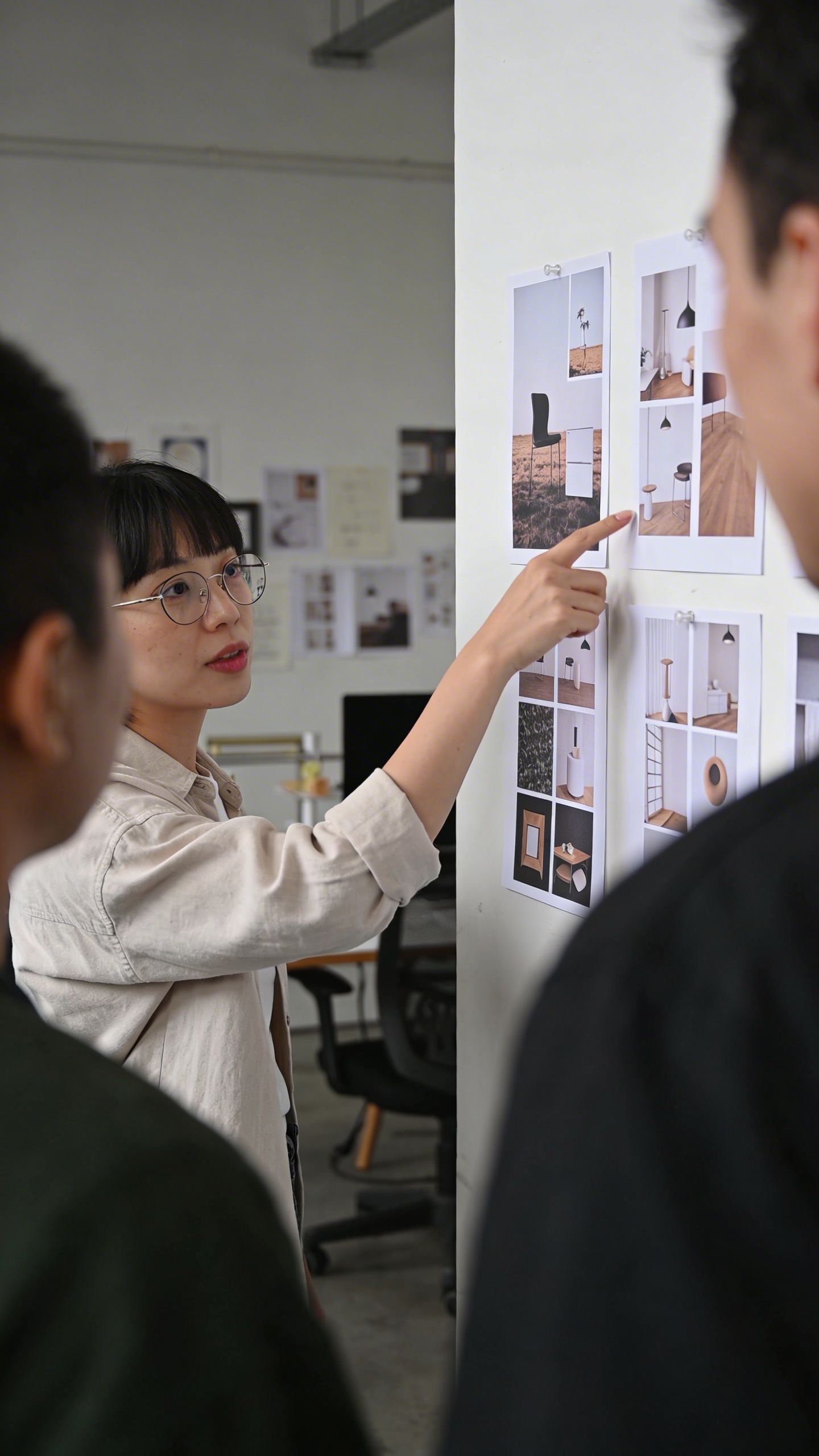 Prompt: "realistic stock photo, small creative studio meeting, person pointing at printed mockups on wall, shallow depth of field, 50mm lens, natural light, muted colors, no visible logos, no text"