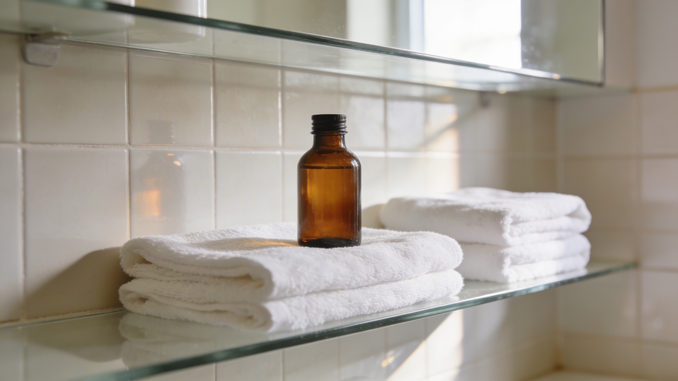 Prompt: "realistic stock photo, minimalist skincare bathroom shelf scene, unlabeled amber glass bottles and white towels, soft daylight, clean tiles, 85mm lens look, gentle highlights and realistic reflections, muted beige and white palette, no text"