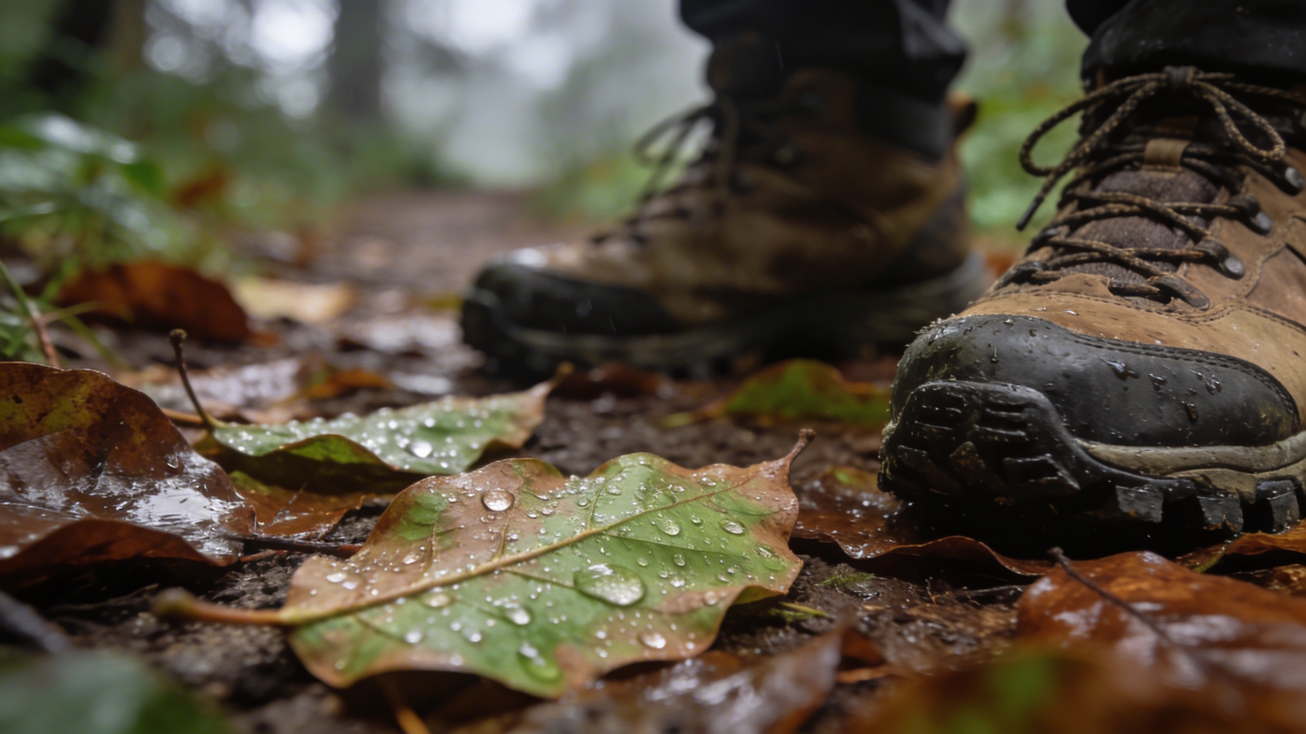 Prompt: "realistic stock photo, close-up of hiking boots on a forest trail with wet leaves, shallow depth of field, cloudy daylight, 50mm lens, earthy tones, no text"