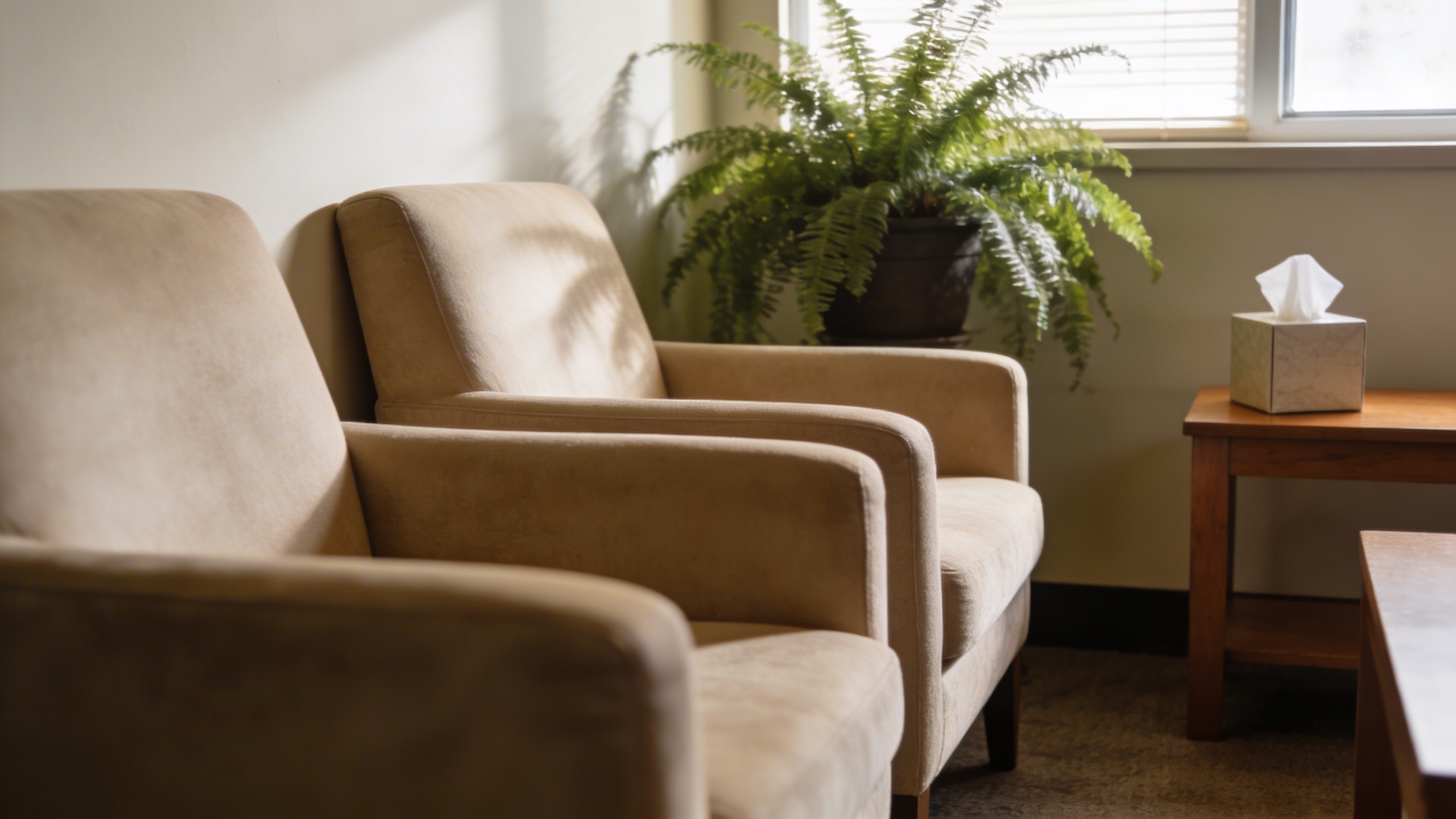 Prompt: "realistic stock photo, therapy office waiting room vibe with soft chairs, plant, tissue box, warm neutral palette, gentle daylight, 35mm lens, calm mood, no text"