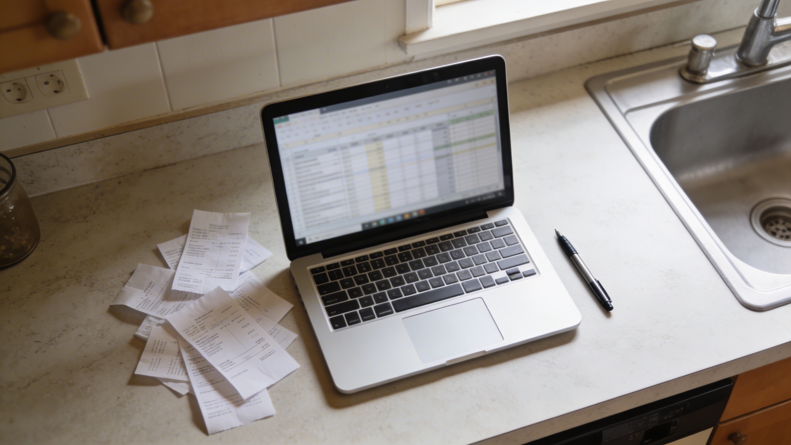 Prompt: "realistic stock photo, kitchen counter with open laptop showing blurred spreadsheet, receipts scattered, pen, realistic overhead daylight, 35mm lens, casual home budgeting vibe, no text"