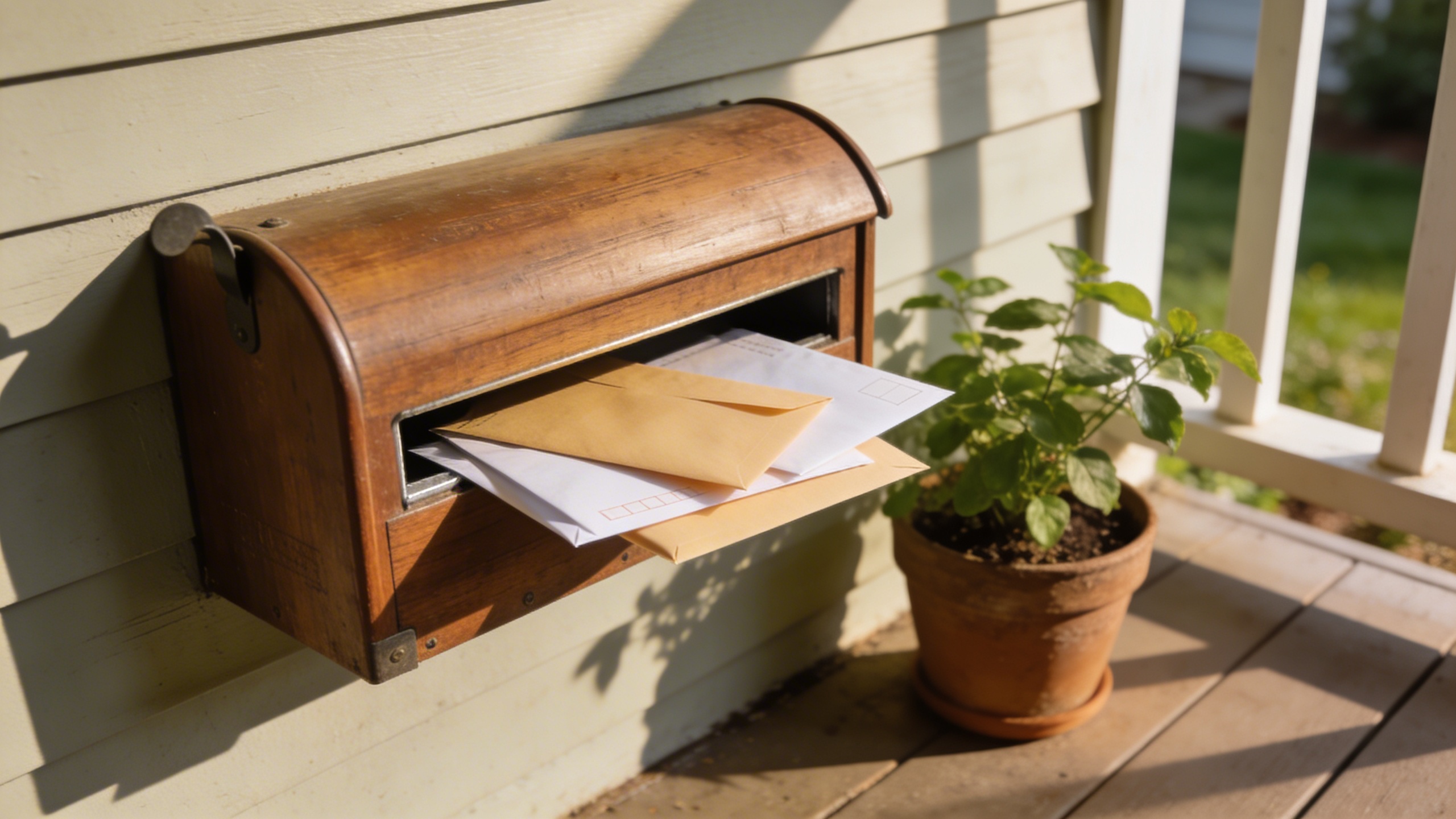 Prompt: "realistic stock photo, mailbox with envelopes and a small plant nearby, suburban porch scene, soft morning light, 35mm lens, gentle shadows, no text"
