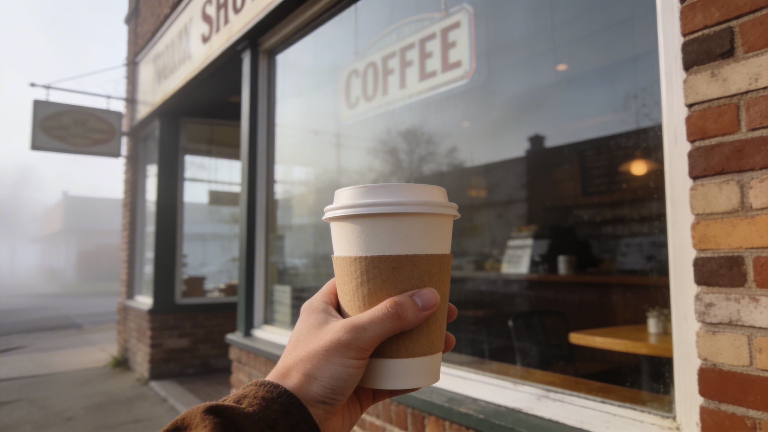Prompt: "realistic editorial stock photo, small-town main street coffee window exterior, hand holding paper cup, soft morning haze, 35mm lens, muted colors, authentic signage blurred and unreadable, no text"