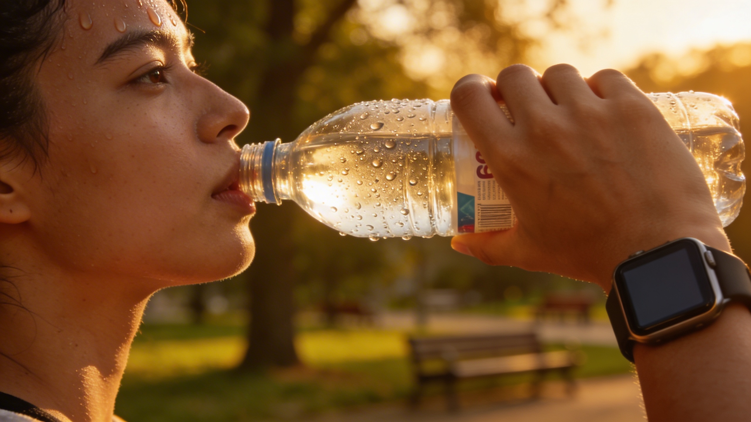 Prompt: "realistic editorial stock photo, hands holding a water bottle after a walk, smartwatch visible but with blank screen, blurred park background, late afternoon golden light, 85mm lens, no text"