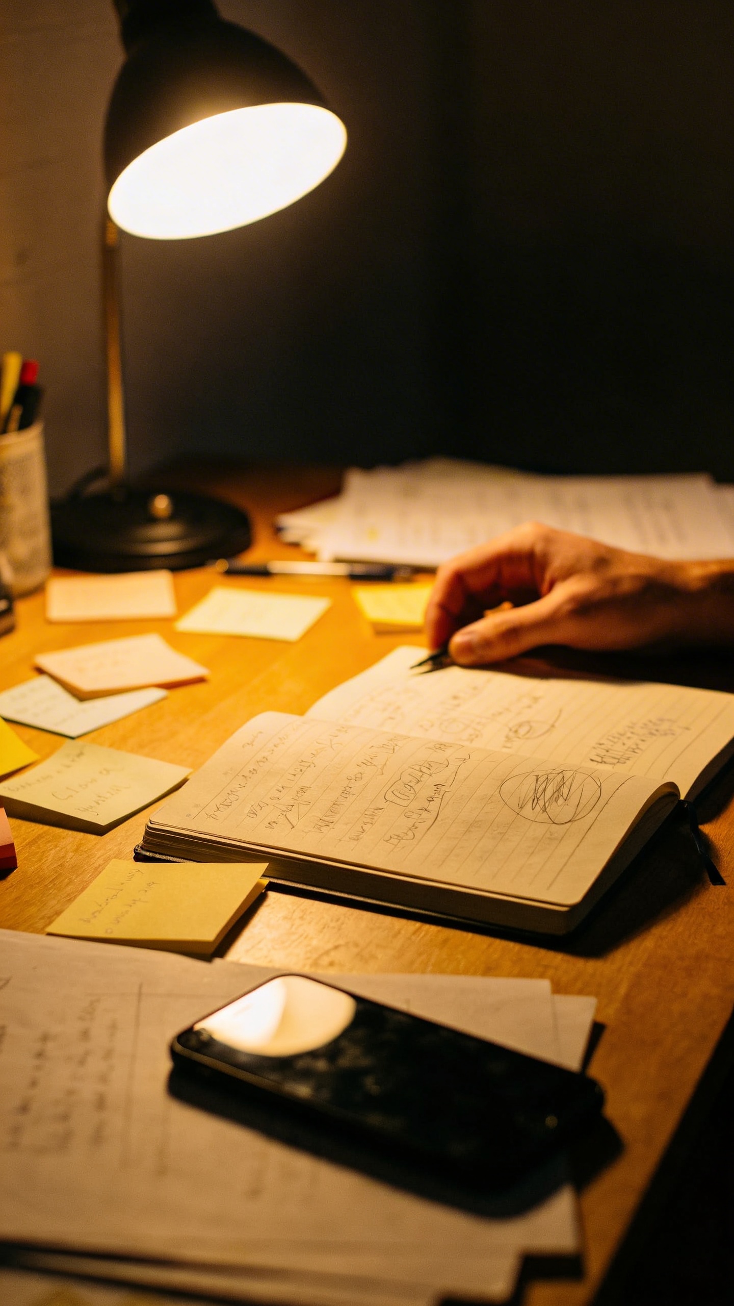 Prompt: "documentary style stock photo, late-night freelancer desk with warm lamp light, sticky notes, half-finished notebook, phone face down, slight clutter, 50mm lens, natural grain, realistic skin tones, no text"