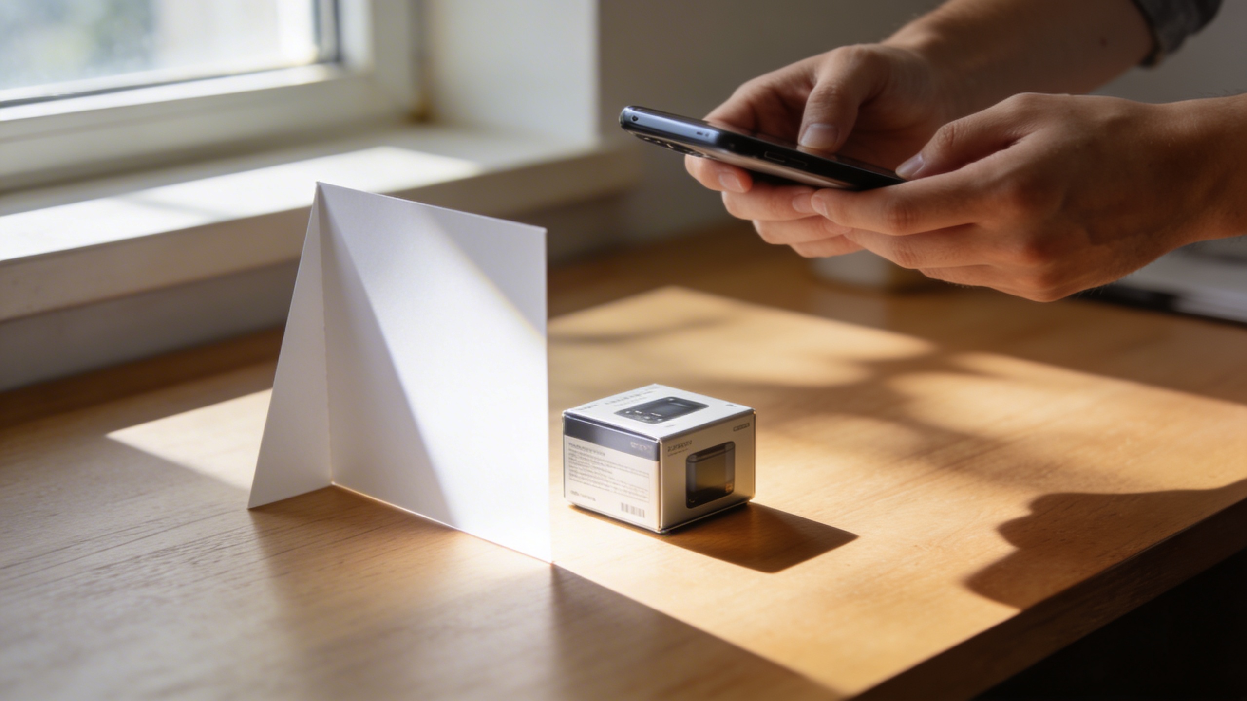 Prompt: "realistic stock photo, hands photographing a small product on a desk with a smartphone, DIY light from a window, simple reflector card, 35mm lens, natural shadows, no text"