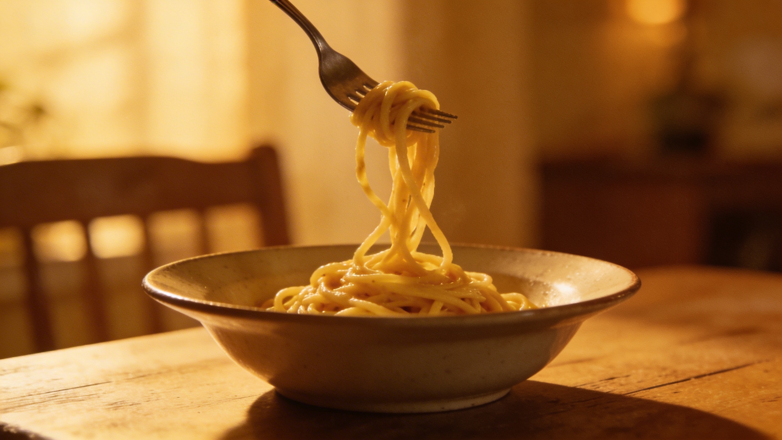Prompt: "realistic stock photo, cozy dinner table with simple pasta bowl, fork twirl mid-air, warm tungsten lighting, shallow depth of field, grain, intimate atmosphere, no text"