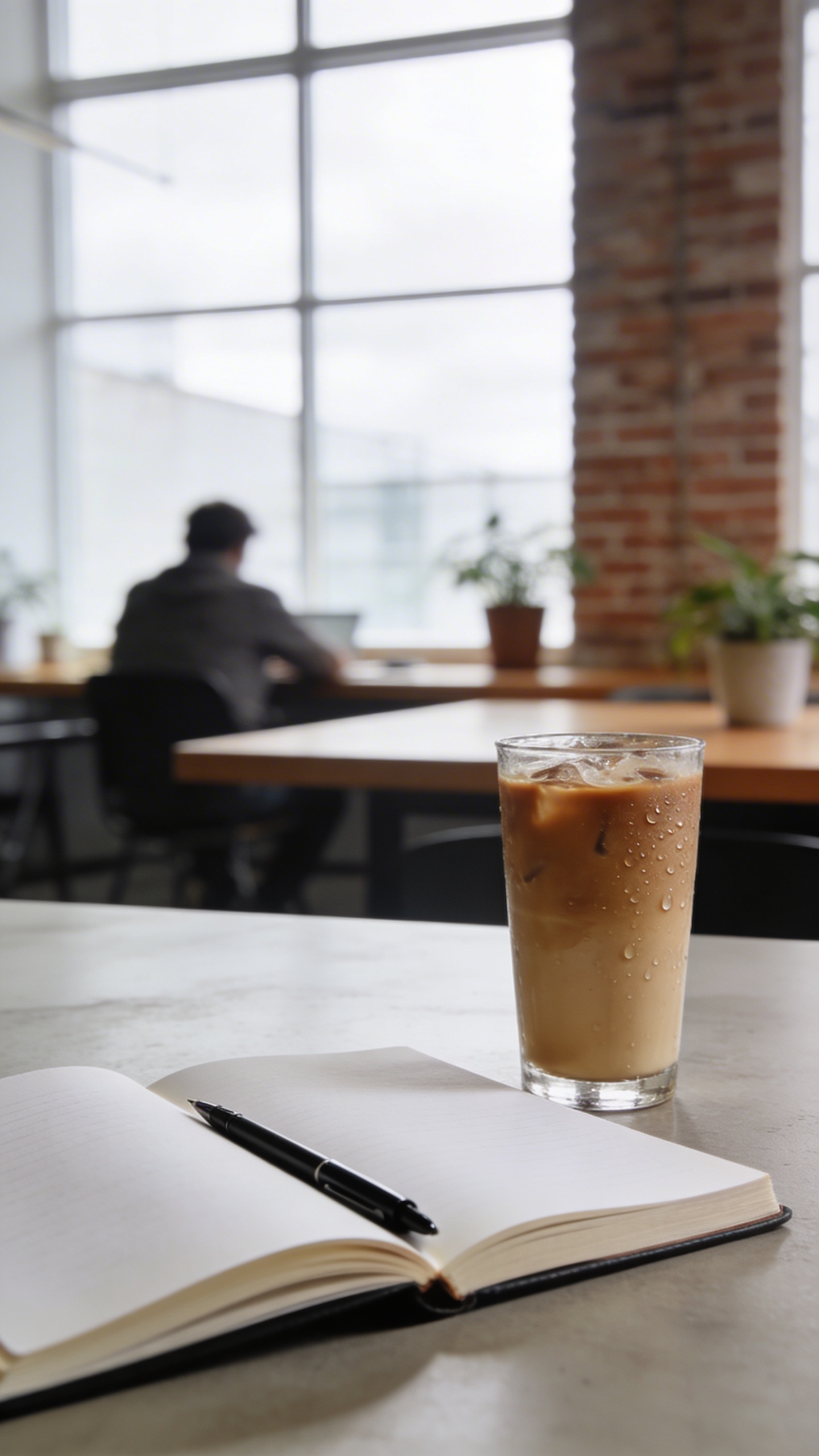 Prompt: "realistic editorial stock photo, coworking space interior with a person in the background out of focus, foreground: open notebook and pen, iced coffee condensation on glass, bright overcast daylight through big windows, 35mm lens, neutral tones, negative space on top"