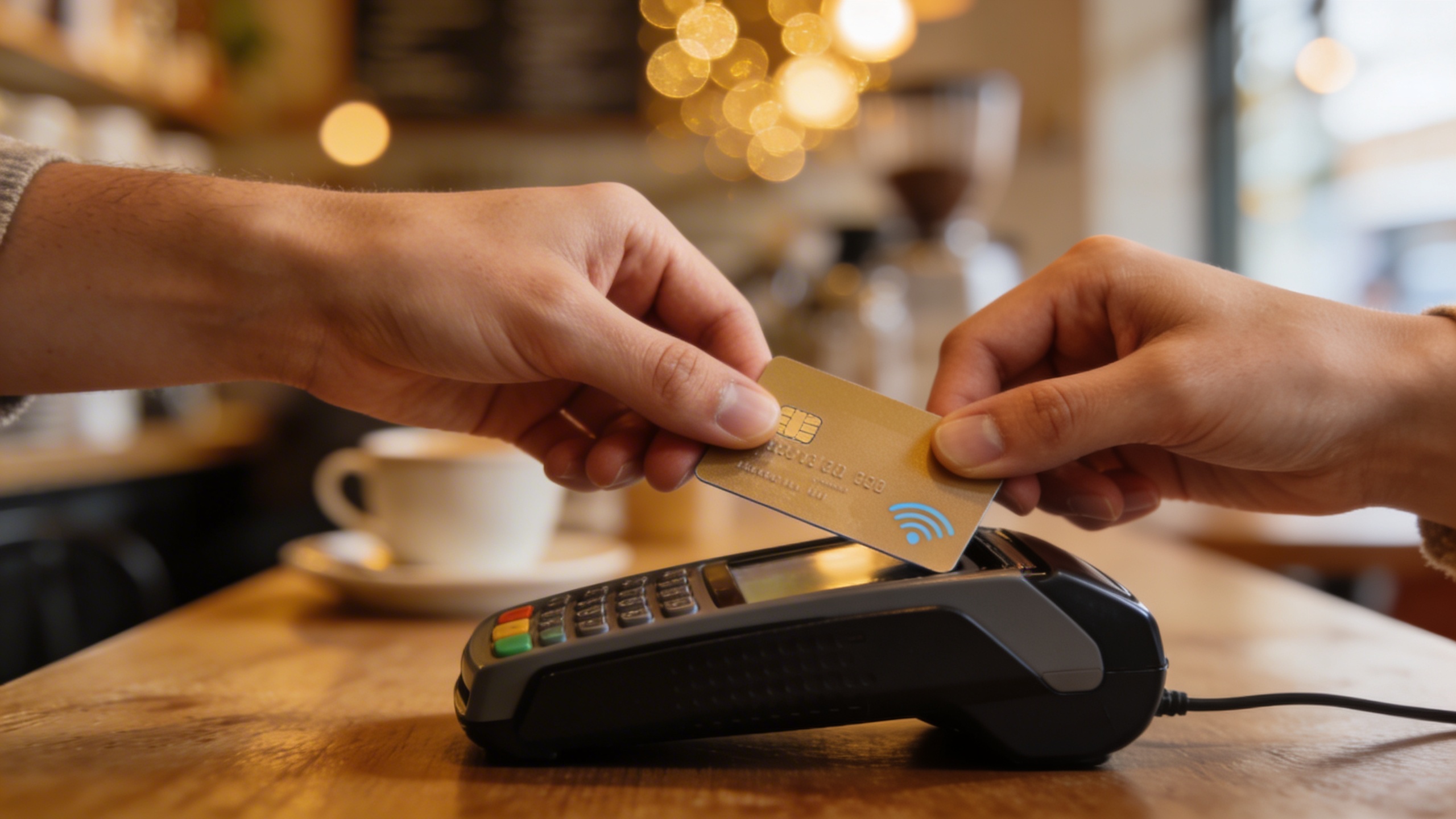 Prompt: "realistic editorial stock photo, close-up of tapping contactless payment on a card reader, hands only, cozy café background bokeh, 50mm lens, natural colors, no visible brand names, no text"
