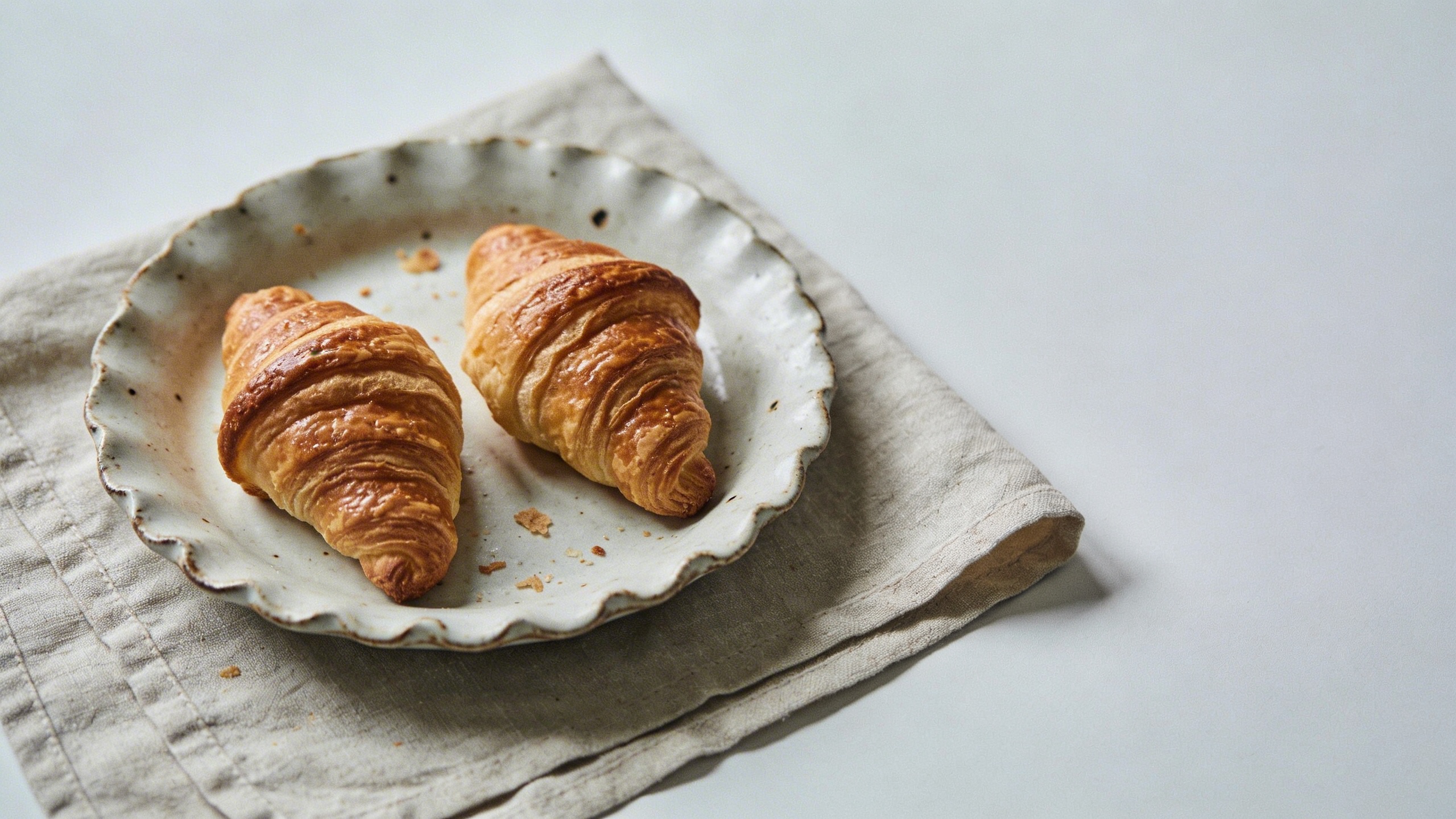 Prompt: "realistic editorial product background, handmade ceramic plate with fresh pastries on linen cloth, soft side light, muted pastel tones, 35mm lens, natural crumbs and imperfections, negative space on right, no text"
