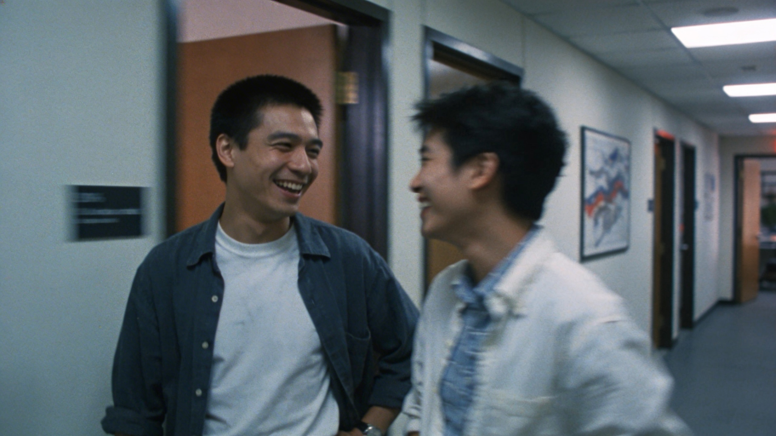 Prompt: "realistic documentary stock photo, hallway conversation outside office, candid laughter, slightly imperfect framing, motion blur, 35mm lens, natural fluorescent mixed lighting, no text"