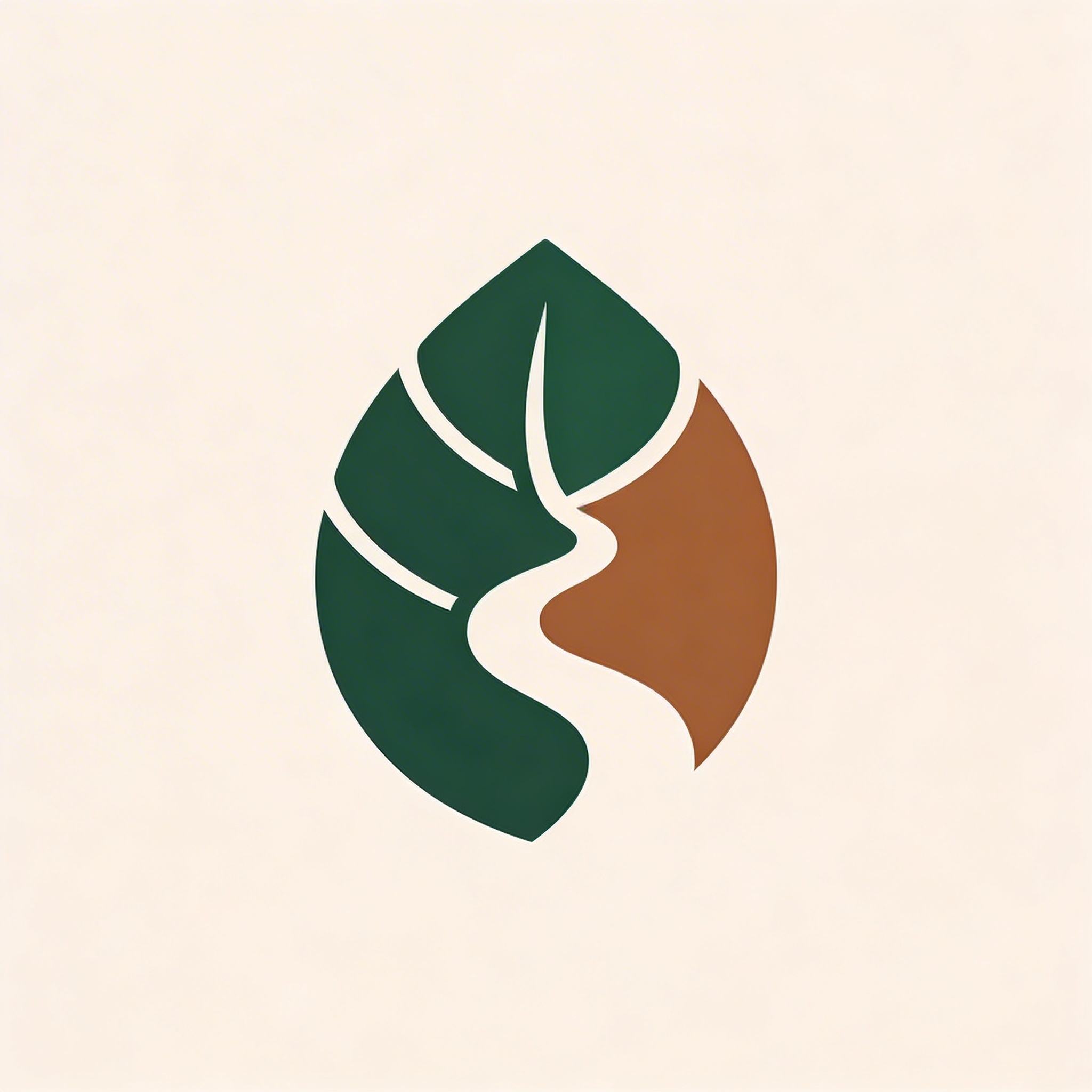 Organic abstract icon: "modern organic brand mark, abstract leaf and river forms merged into a simple icon, smooth rounded shapes, flat vector logo, earthy palette of deep forest green and clay brown, minimal detail, scalable, no gradients, no mockup"
