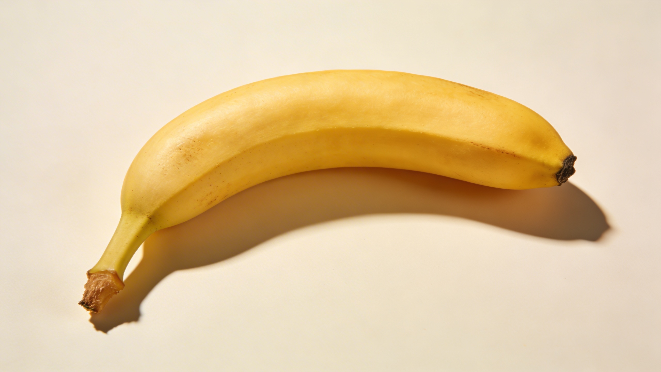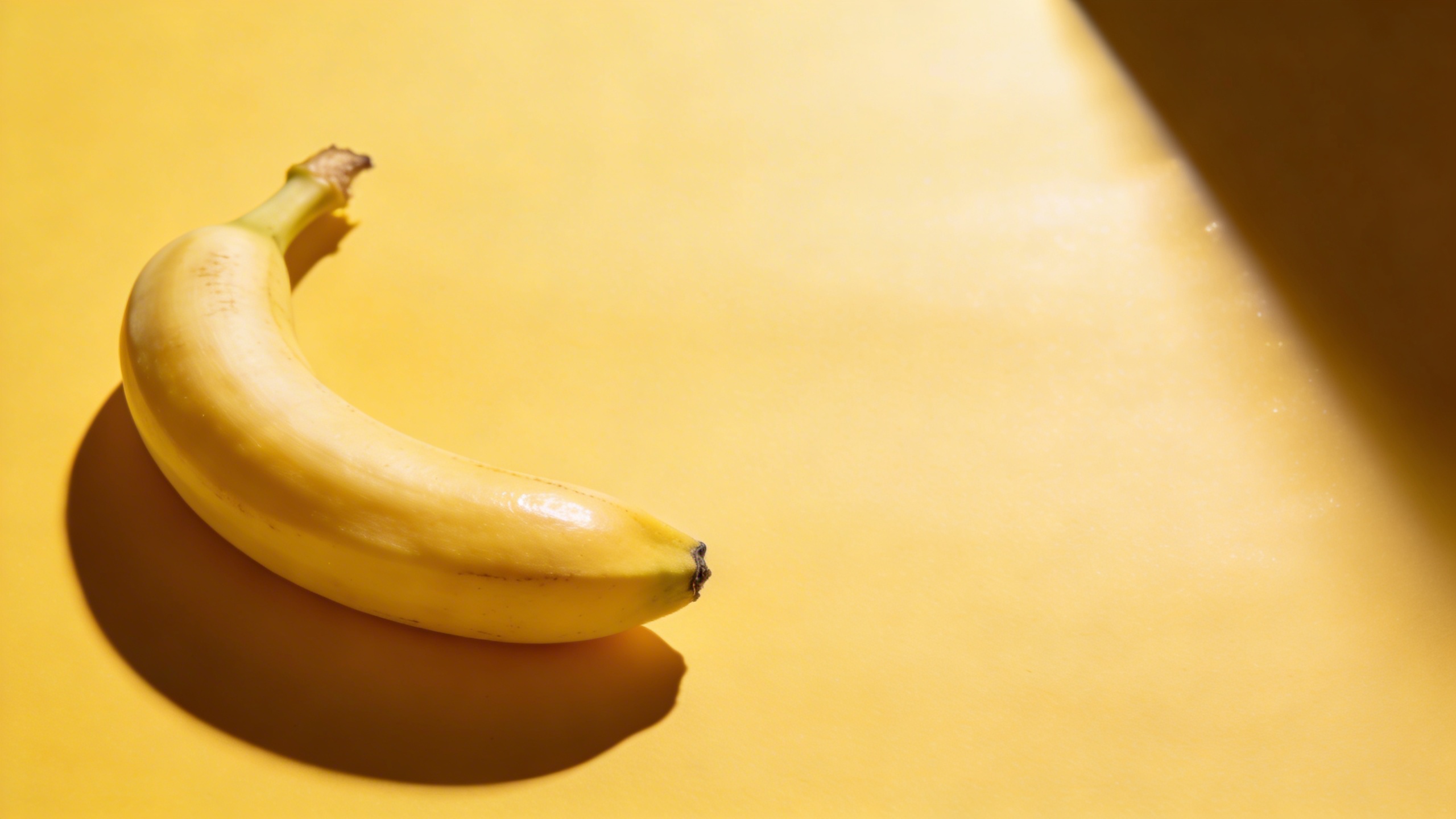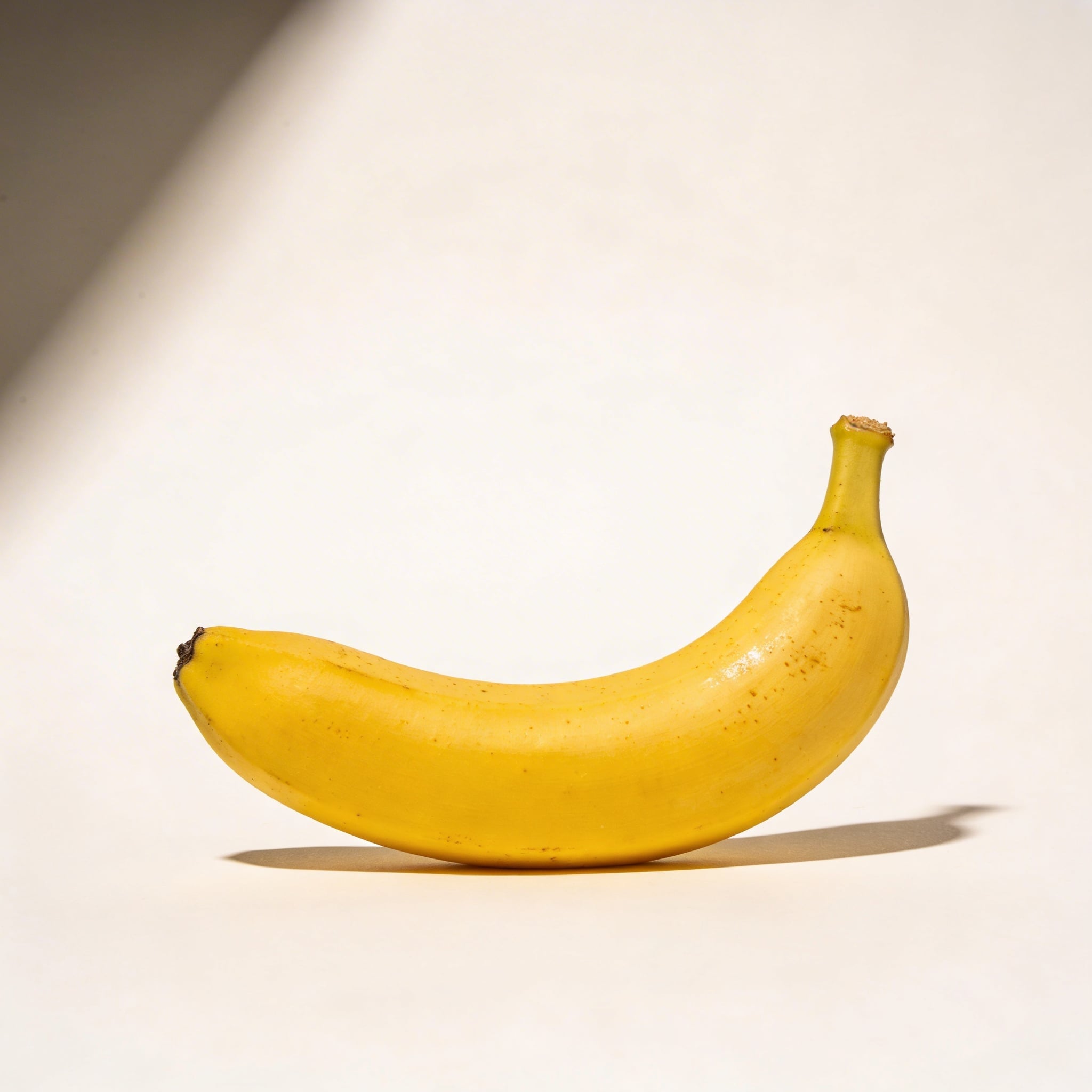Prompt: "commercial stock photo of banana on pastel yellow seamless background, hard flash on camera right for a crisp shadow edge, glossy highlight on peel, modern editorial aesthetic, subject placed left third with negative space on right, 85mm lens look, no text, no watermark"