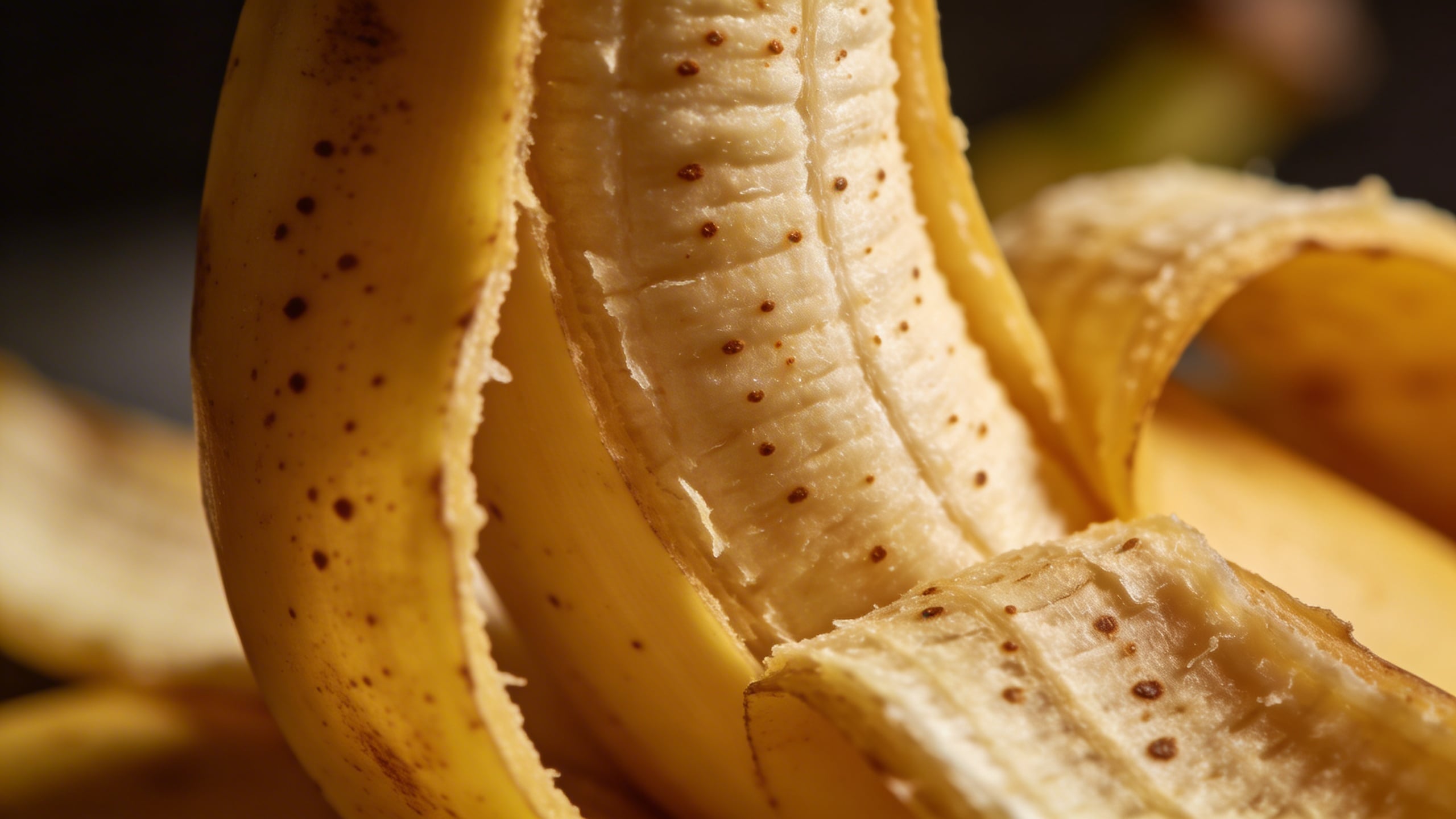 Prompt: "macro product photo, close-up of banana peel texture with tiny brown speckles, ultra detailed, soft studio lighting, shallow depth of field, abstract background blur, high-end stock photography, no text, no watermark"