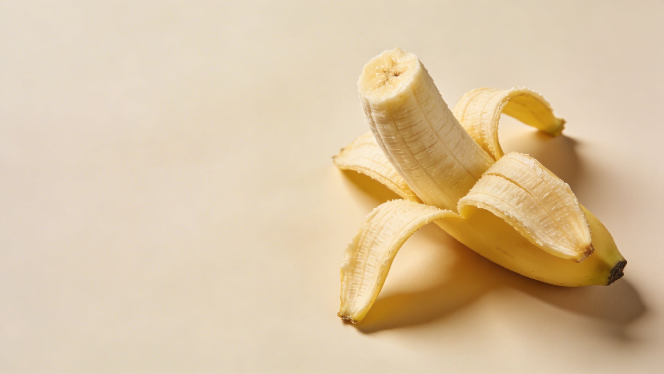Prompt: "commercial product photography, peeled banana half-open resting on pale beige seamless background, soft diffused studio lighting, subtle shadow, crisp realistic fiber texture on peel, close-up with shallow depth of field, composition bottom-right with large negative space on left, no text, no watermark"