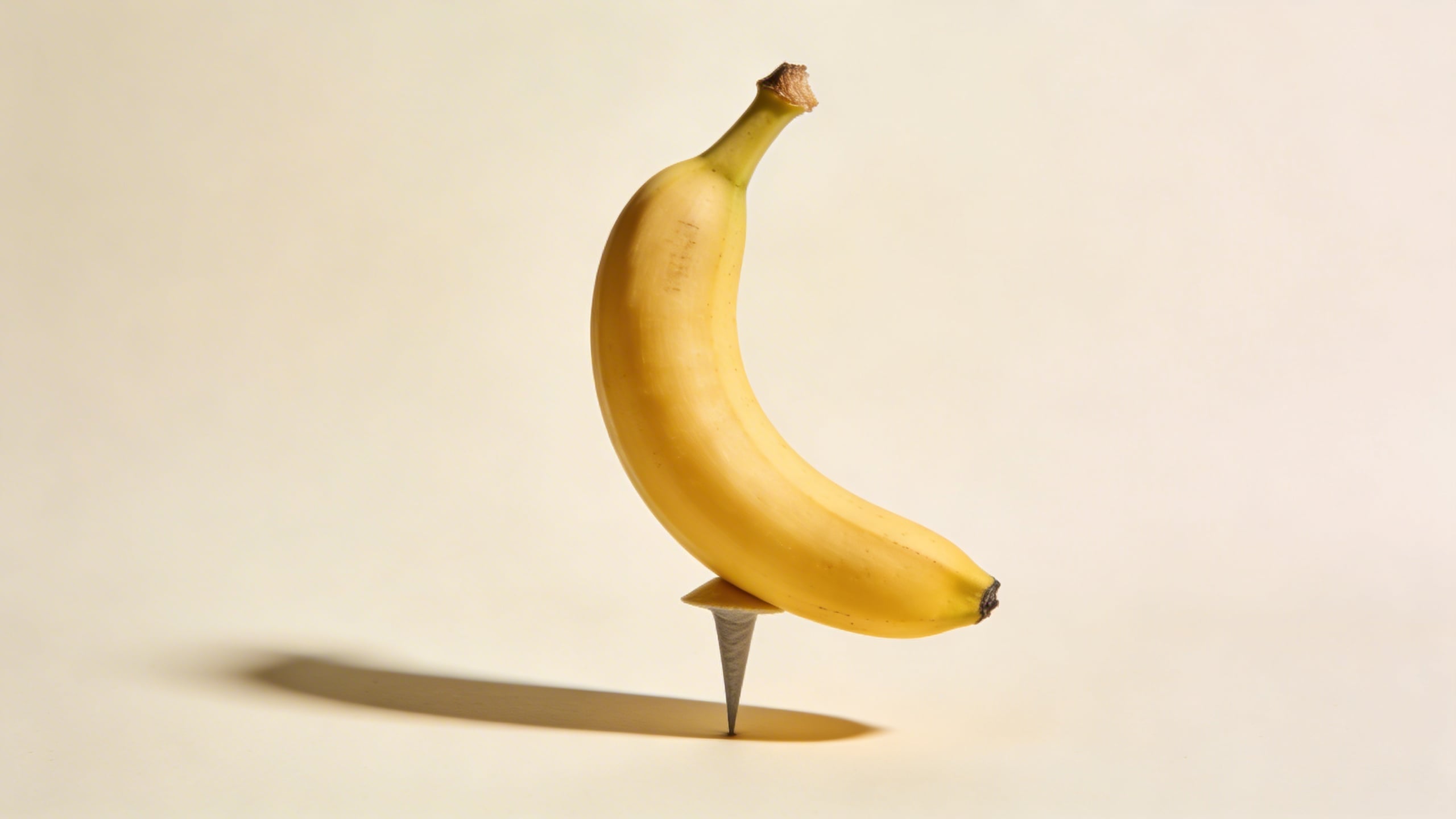 Prompt: "commercial conceptual photo, banana balanced perfectly upright on its tip using a hidden support look, pale cream background, studio lighting, sharp defined shadow, minimal modern composition, 85mm lens look, lots of copy space, photoreal"