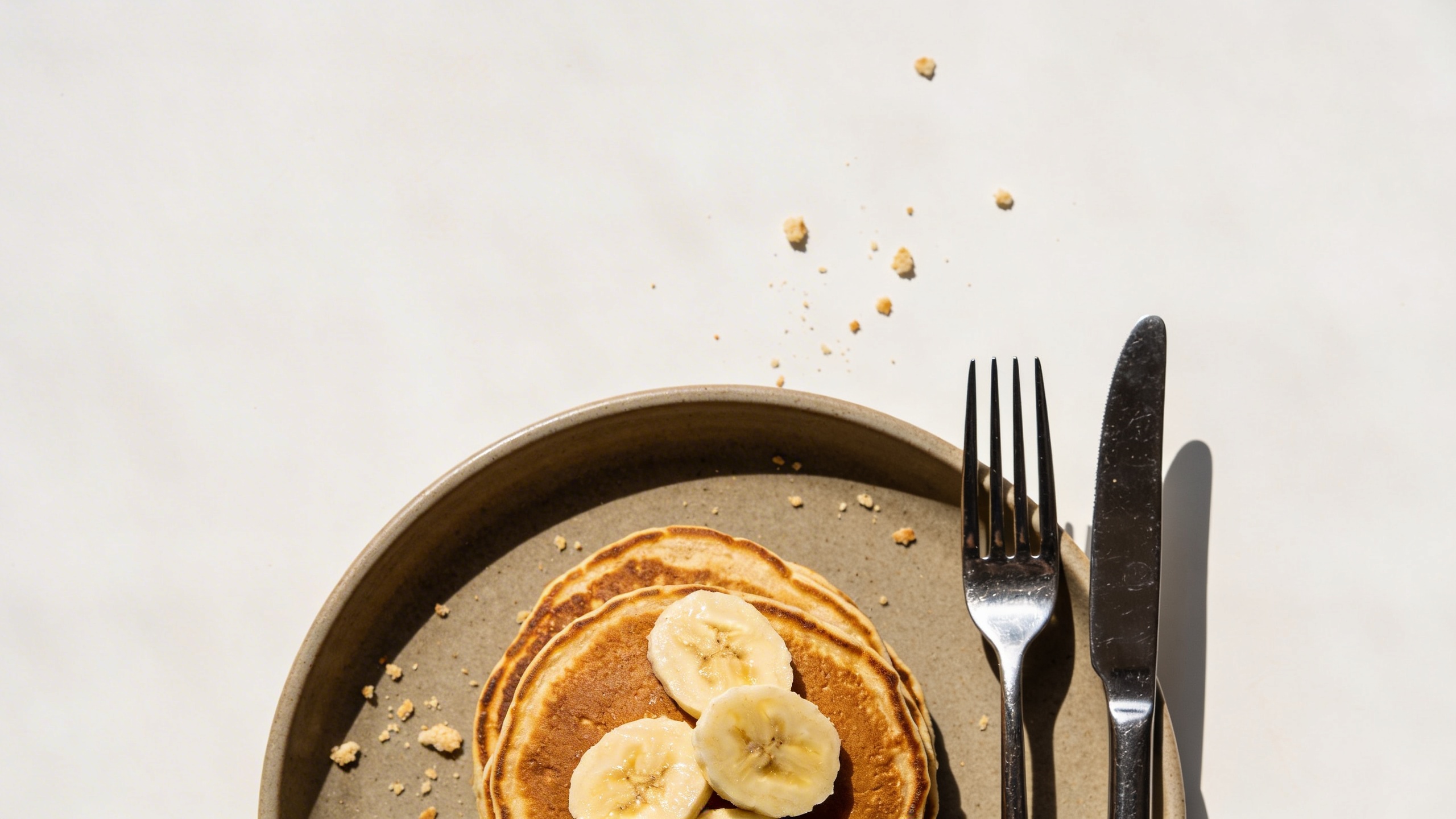 Prompt: "top-down flat lay, banana pancakes on a matte ceramic plate, fork and knife aligned neatly, minimal crumbs, bright natural daylight, clean editorial food photography, muted warm palette, copy space at top, no text, no watermark"