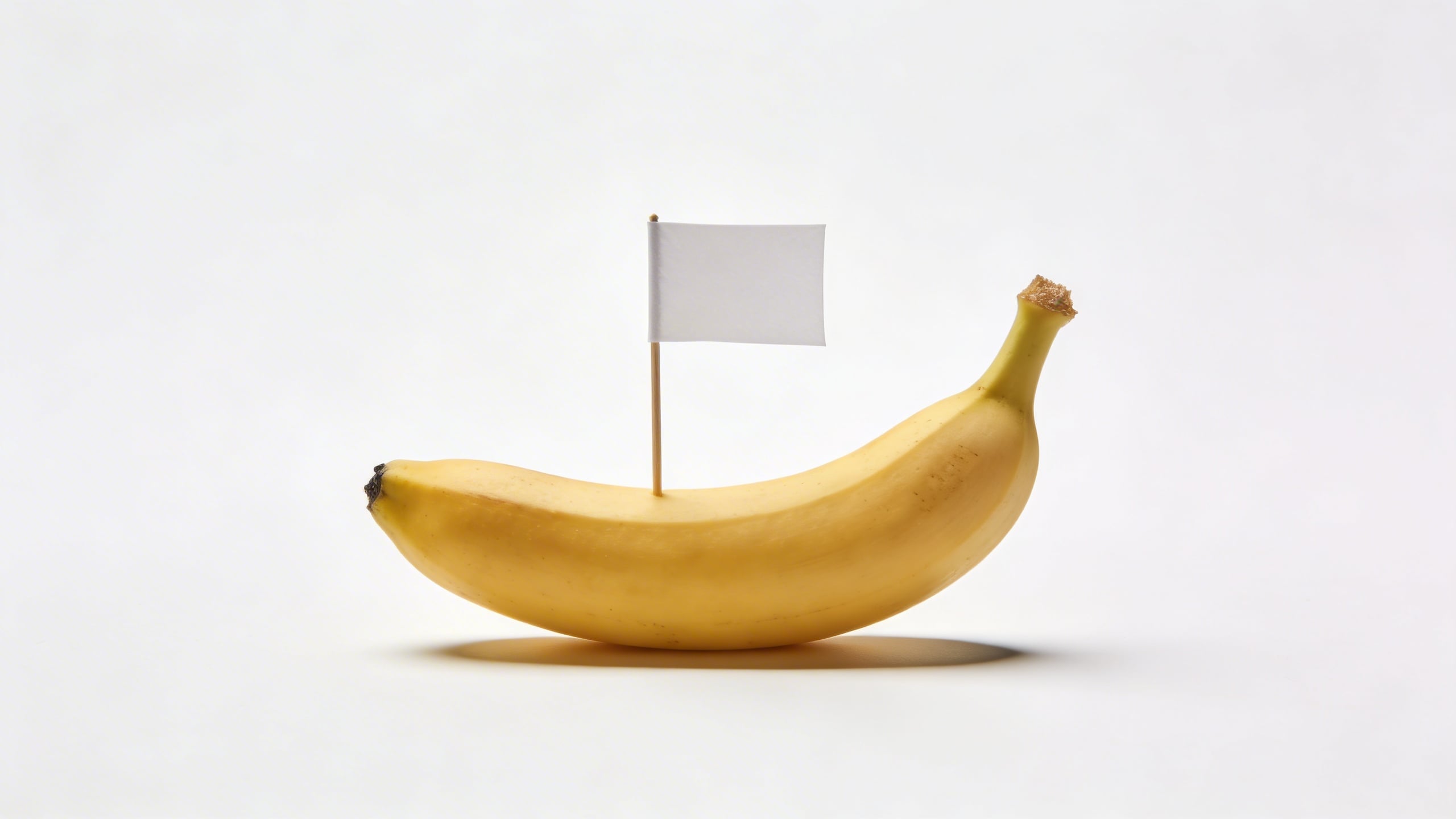 Prompt: "conceptual stock photo, banana with a tiny minimalist flag toothpick blank (no writing) stuck in the peel, clean beige background, softbox lighting, gentle shadow, simple milestone concept, copy space above, photoreal"