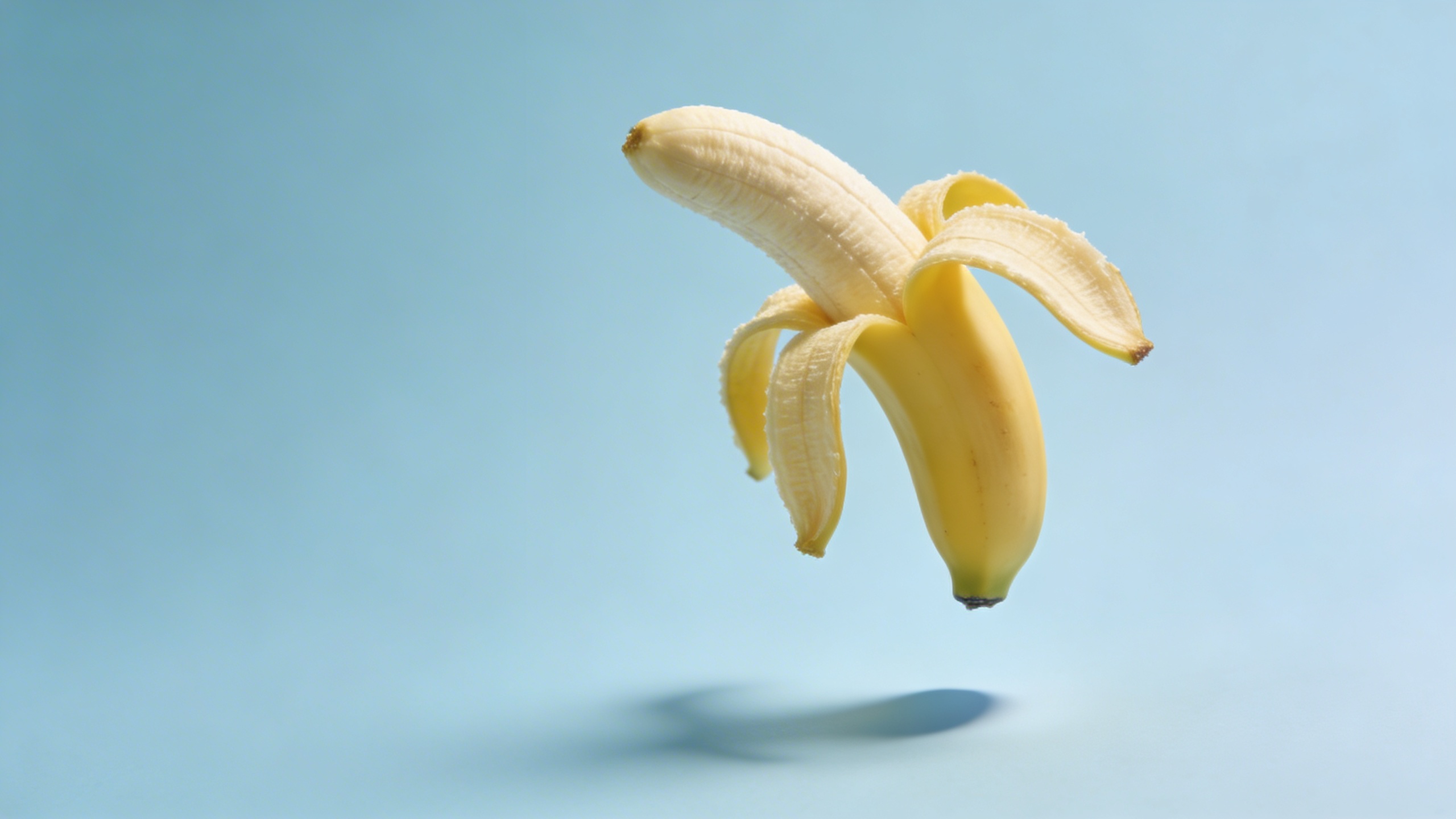 Prompt: "surreal but clean editorial stock photo, banana floating slightly above a pale blue seamless background, soft shadow beneath as if suspended, studio lighting, crisp realistic peel texture, minimal composition with large negative space on left, photoreal, no text"