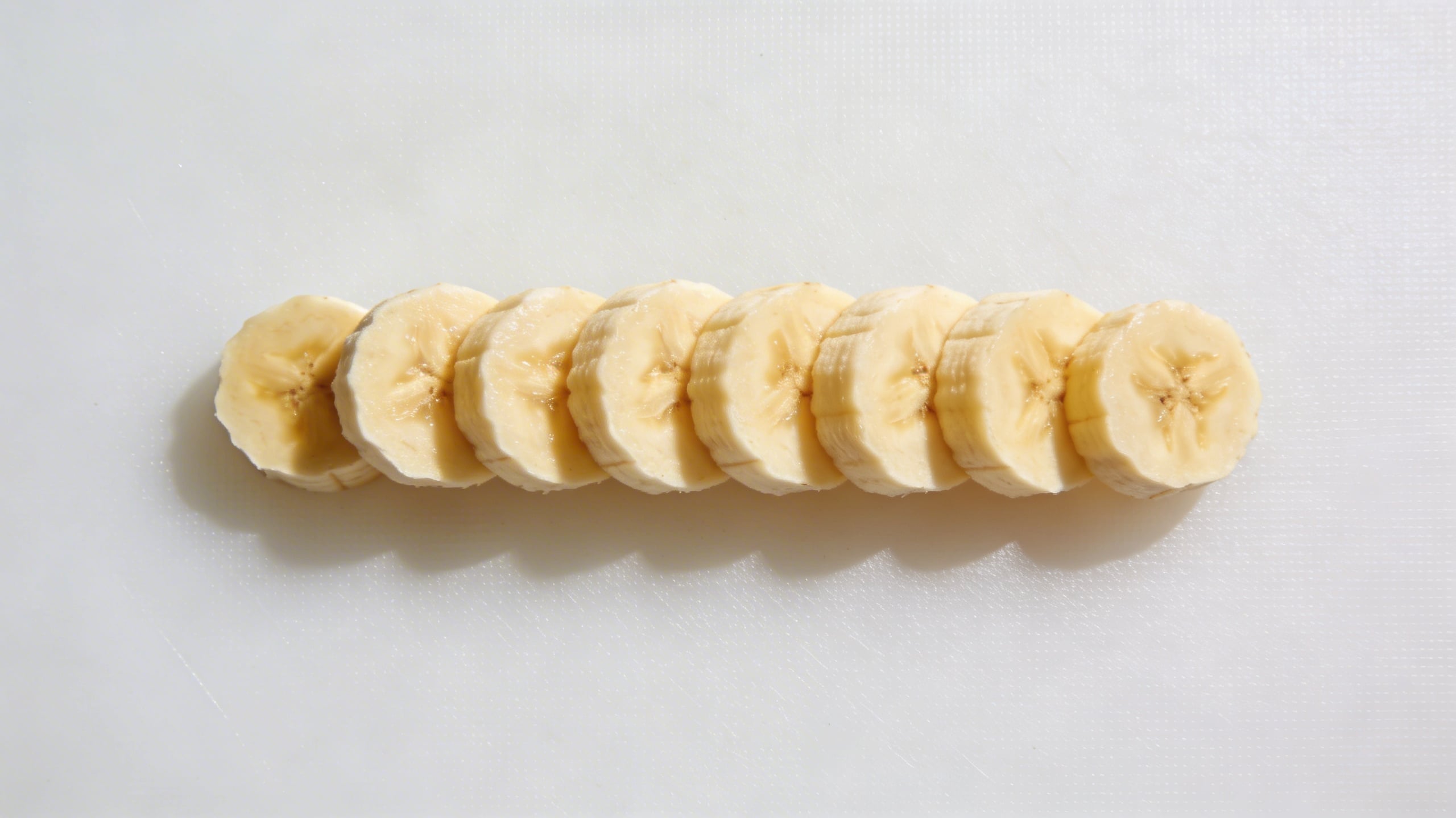 Prompt: "editorial stock photo, banana slice arrangement in a neat line on matte white acrylic surface, top-down flat lay, soft shadow, bright airy studio lighting, minimal props, 35mm overhead lens look, copy space at top, photoreal, no text"