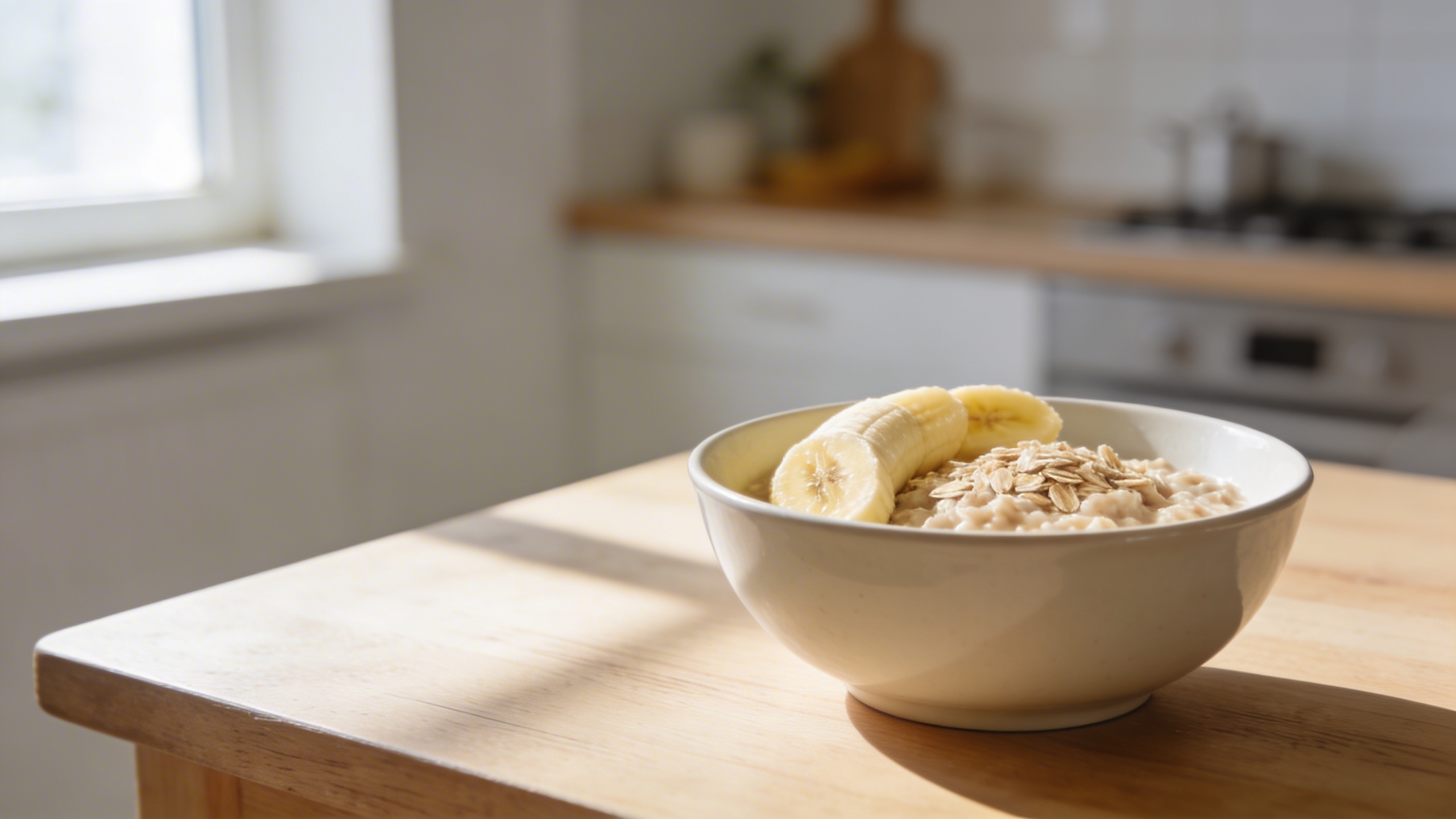 Prompt: "bright lifestyle stock photo, banana and oatmeal bowl on a light oak kitchen table, morning window light, soft shadows, minimal Scandinavian kitchen background softly blurred, 35mm lens look, natural color grading, copy space in upper left, no text, no watermark"