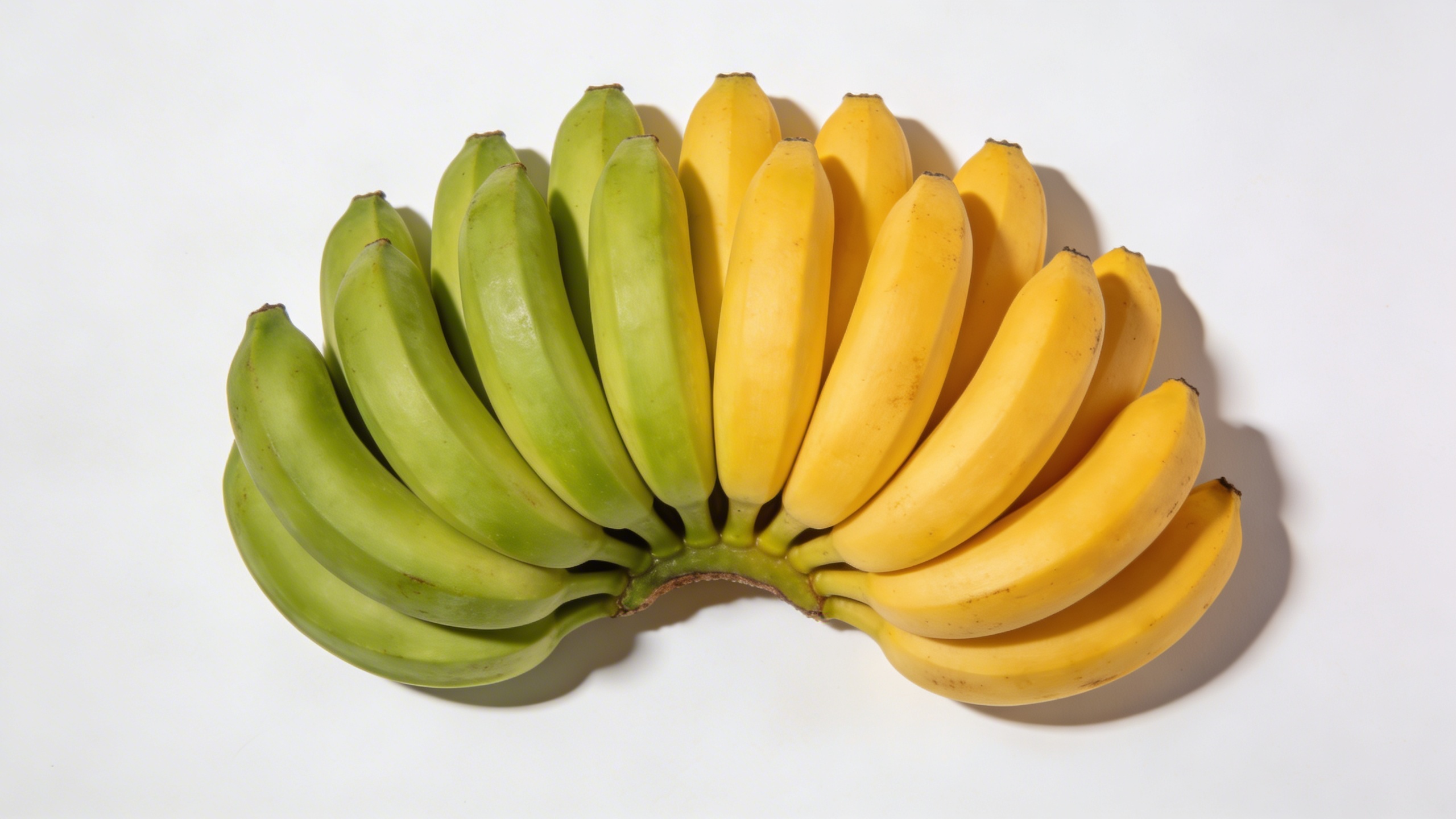 Prompt: "high-end commercial stock photo, bunch of bananas arranged neatly like a gradient from green to ripe yellow, on warm white seamless background, soft studio lighting, minimal shadows, top-down composition, copy space at bottom, photoreal, no text"