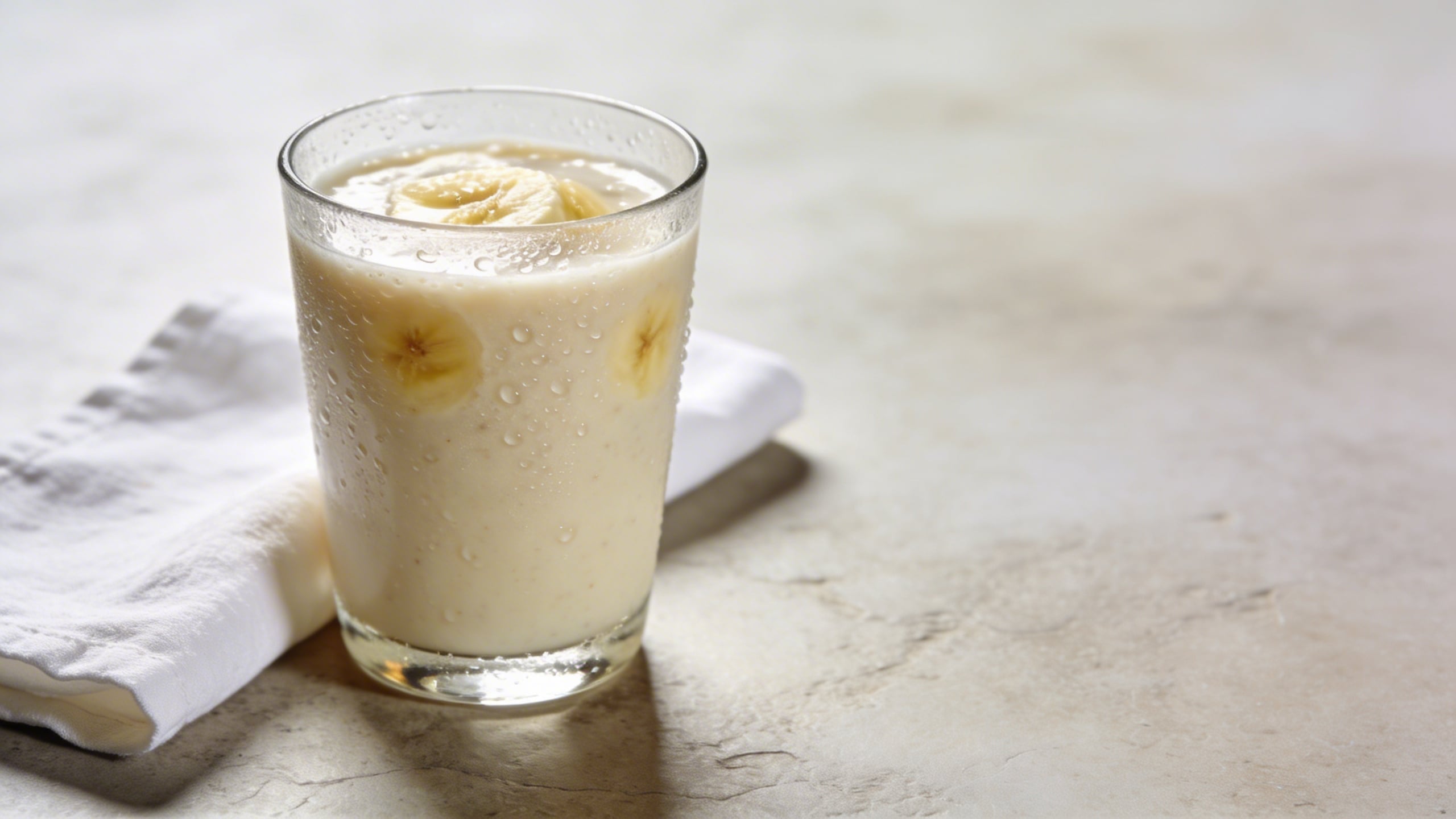Prompt: "editorial stock photo, banana smoothie in clear glass with condensation, simple white linen napkin, neutral stone countertop, soft daylight, realistic reflections and refraction, shallow depth of field, copy space on right, no branding, no text"
