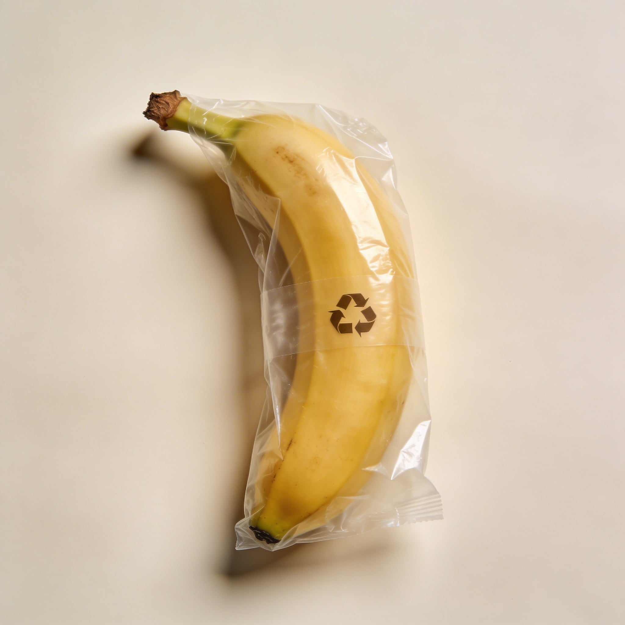 Prompt: "commercial conceptual stock photo, banana wrapped in a transparent minimal plastic film with a small recycle symbol shape implied (no readable text), on clean white seamless background, softbox lighting, crisp shadows, modern sustainability concept, subject centered with copy space above, photoreal"
