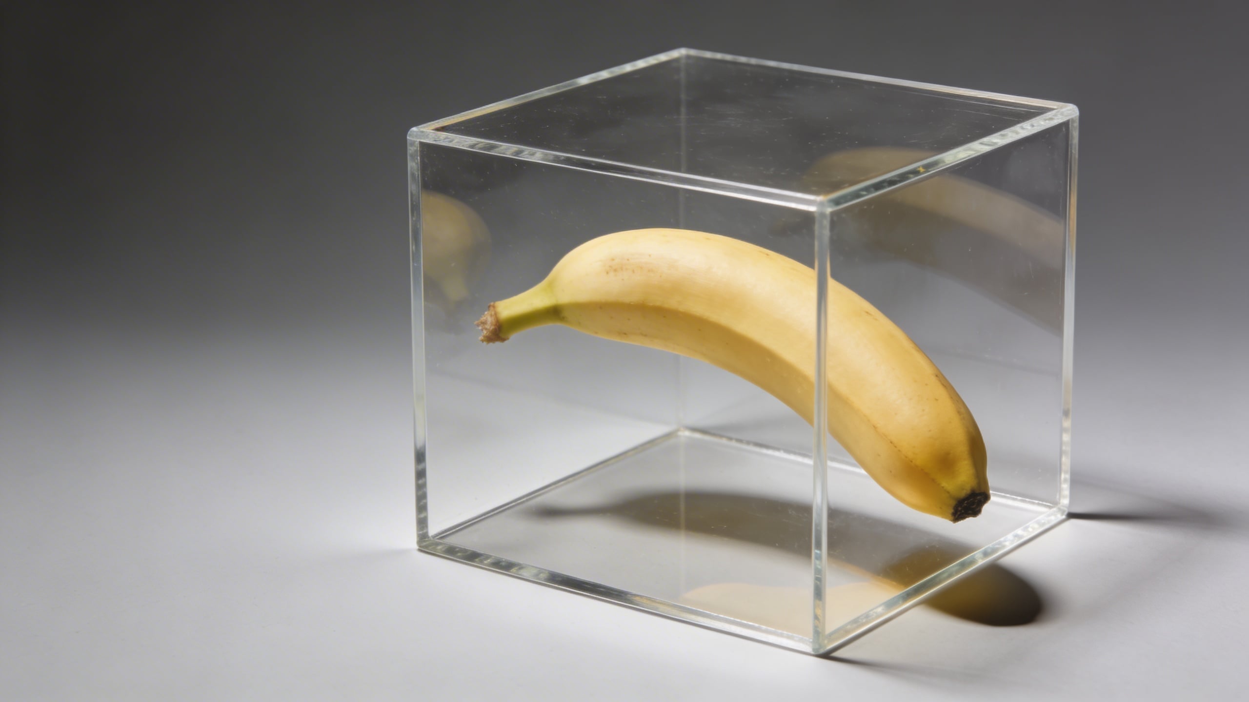 Prompt: "editorial stock photo concept, banana in a clear acrylic display cube, museum-like presentation, dramatic but soft studio lighting, gentle reflections, minimalist gray background, high-end product photography style, copy space on left, photoreal, no text"