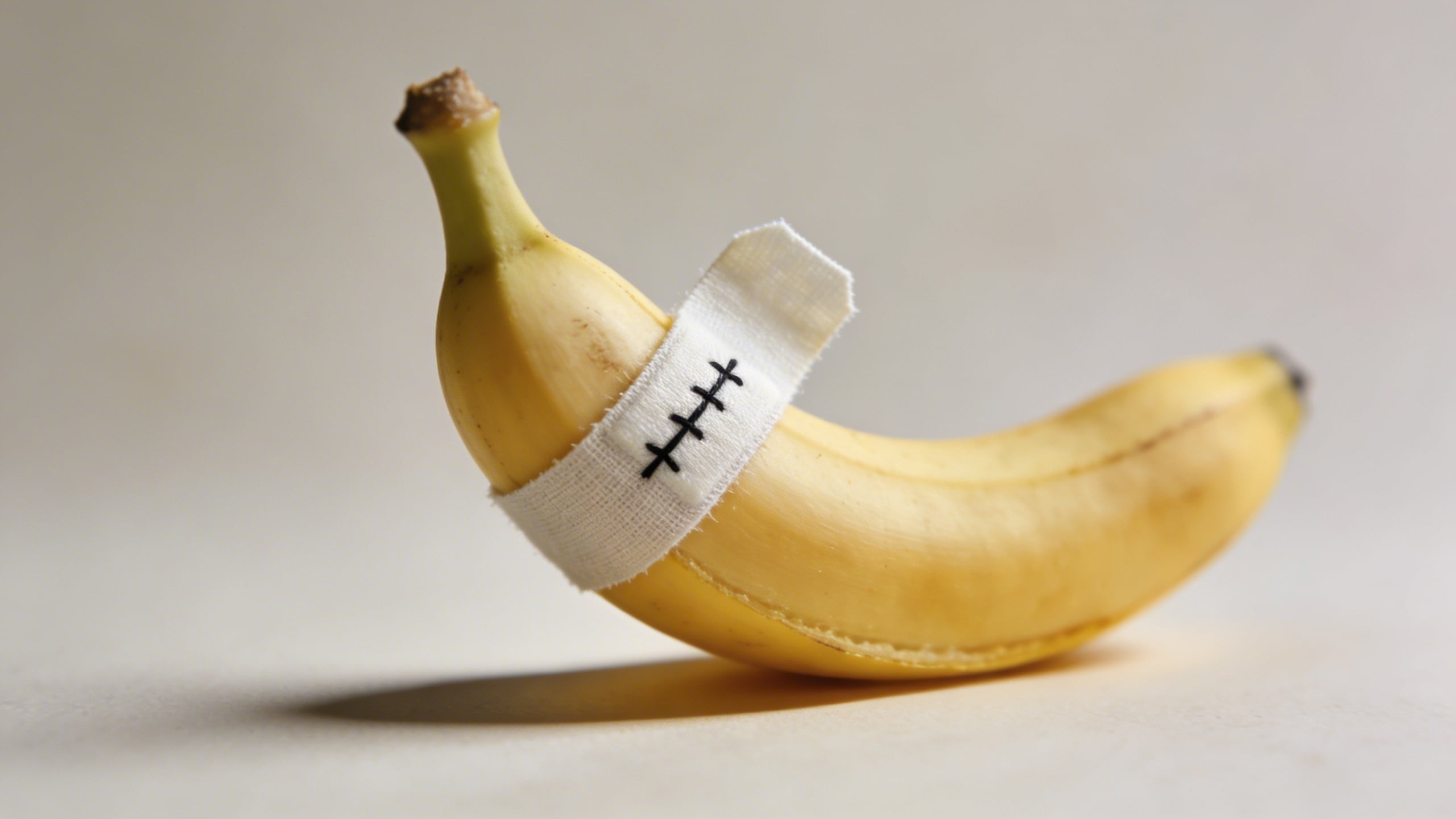 Prompt: "conceptual stock photo, banana with a small stitched bandage on peel (no text), on warm gray seamless background, softbox lighting, gentle shadow, healthcare or recovery metaphor, realistic detail, minimal composition, copy space top right"