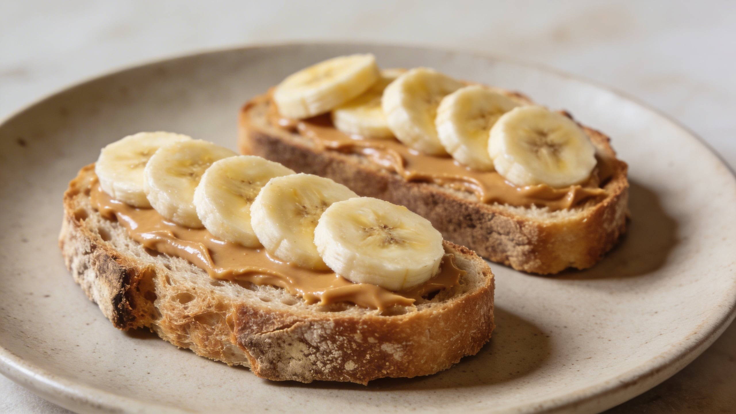 Prompt: "editorial food stock photo, banana and peanut butter toast on rustic sourdough, neutral ceramic plate, natural daylight, shallow depth, minimal styling, warm clean color grade, copy space in background, no text, no watermark"