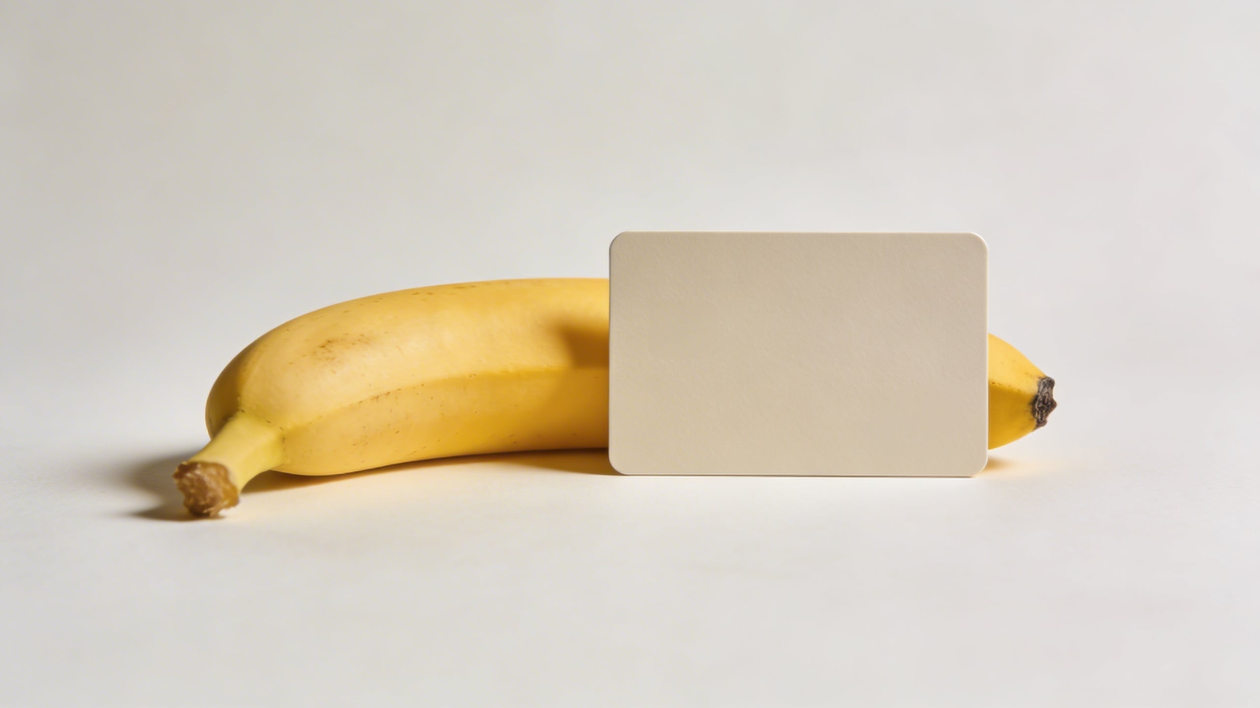 Prompt: "conceptual stock photo, banana next to a simple credit card-shaped blank object (no logos, no numbers), on clean white surface, studio lighting, minimal finance metaphor, subject on right third with copy space left, photoreal"