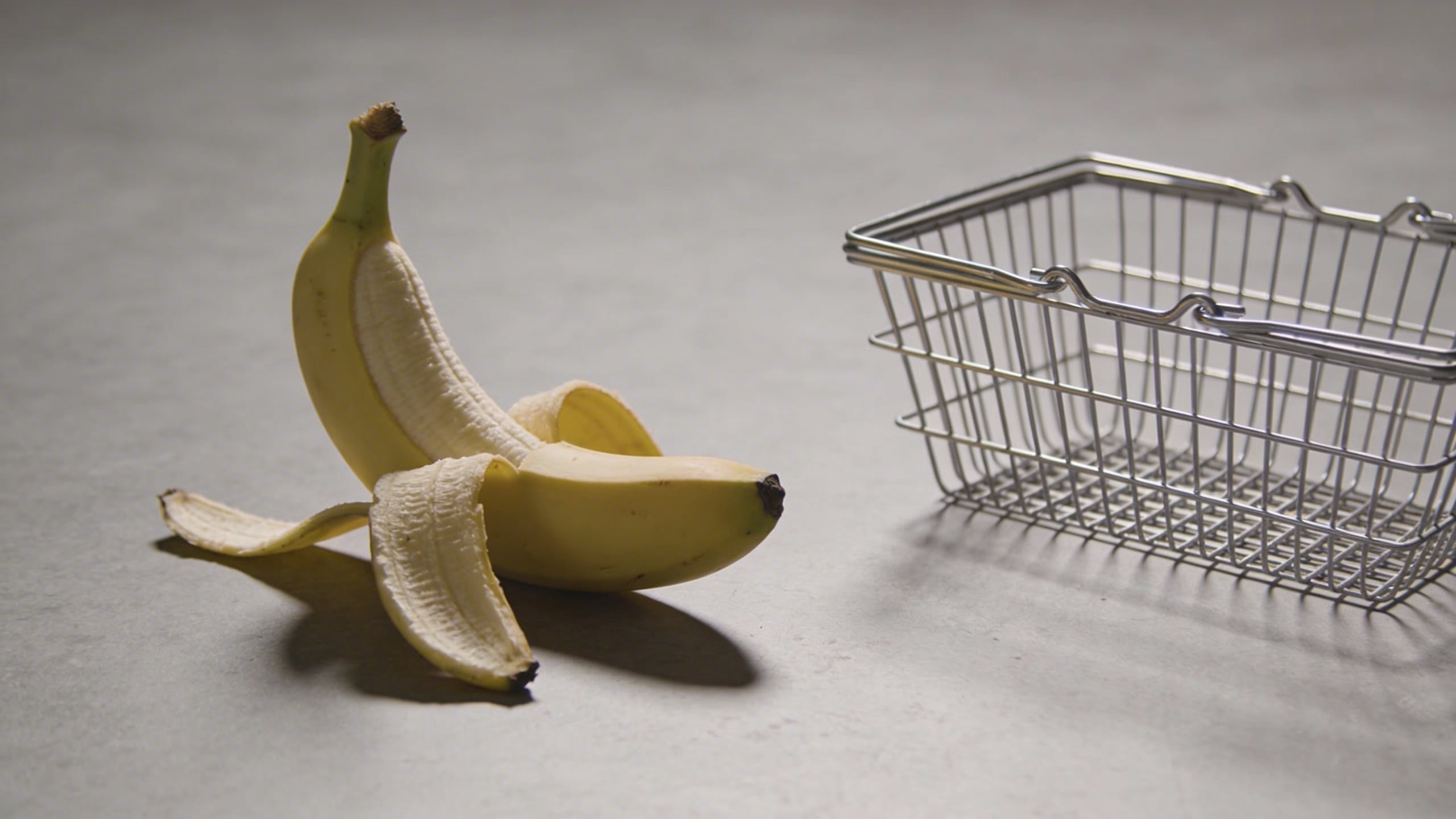 Prompt: "editorial stock photo, banana and a simple empty shopping basket on neutral gray floor, soft diffused light, realistic shadow, minimal composition with copy space on right, photoreal, no logos"