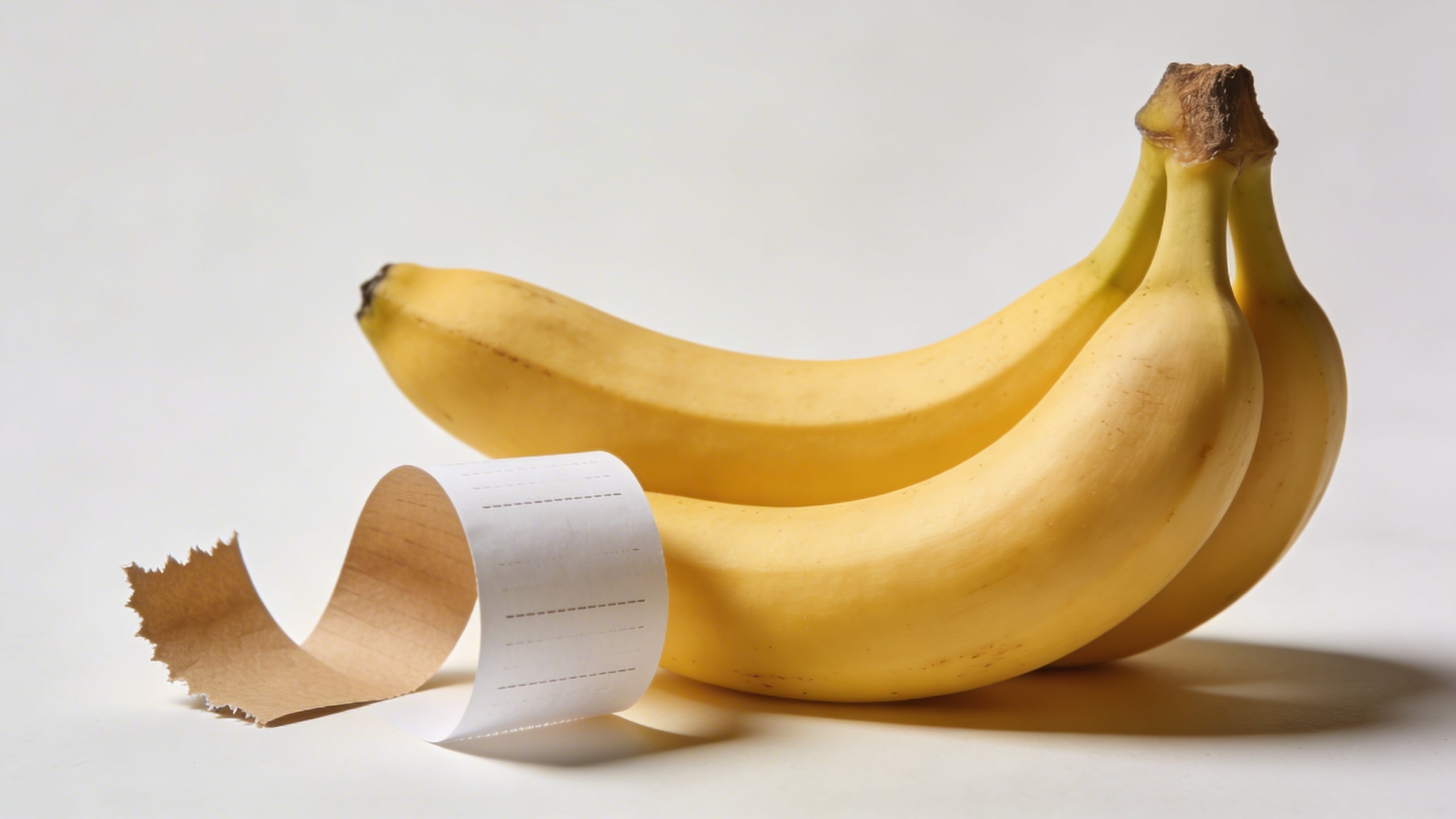 Prompt: "commercial conceptual stock photo, banana with a small thermal receipt paper strip curling beside it (blank, no readable text), on clean white table, soft daylight, minimal finance budgeting concept, copy space top left, photoreal"