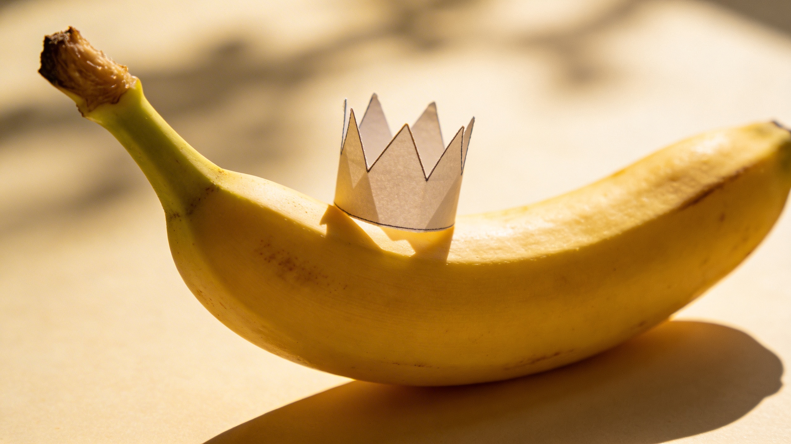Prompt: "editorial stock photo, banana with a small paper crown (simple, no text) on top, pastel pink seamless background, softbox lighting, gentle shadow, playful but clean composition, copy space on left, photoreal"