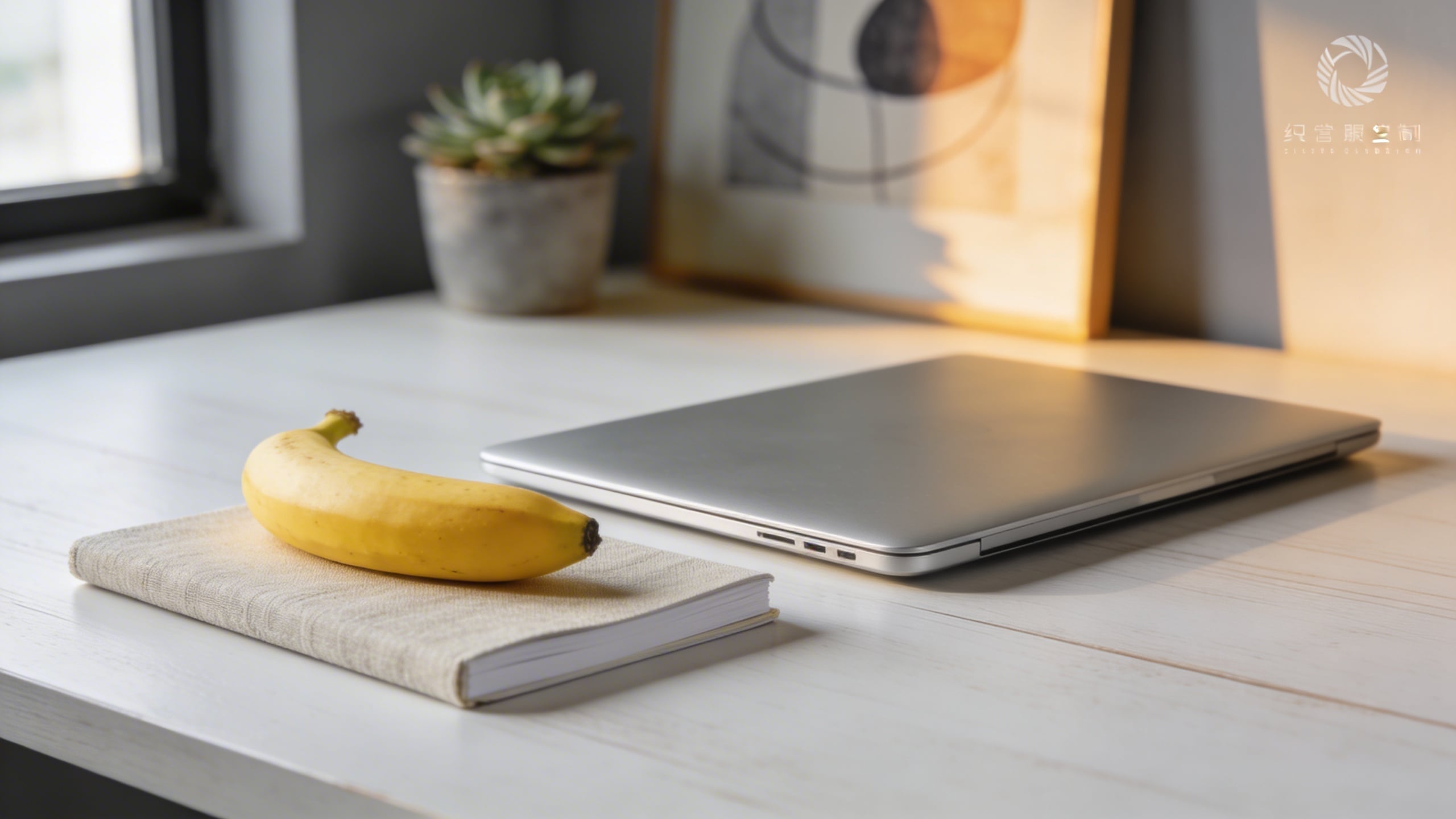 Prompt: "modern office lifestyle stock photo, banana next to a closed laptop and a minimal notebook on a clean desk, soft window light, neutral gray and warm wood palette, shallow depth of field, copy space in upper right, no visible logos, photoreal"
